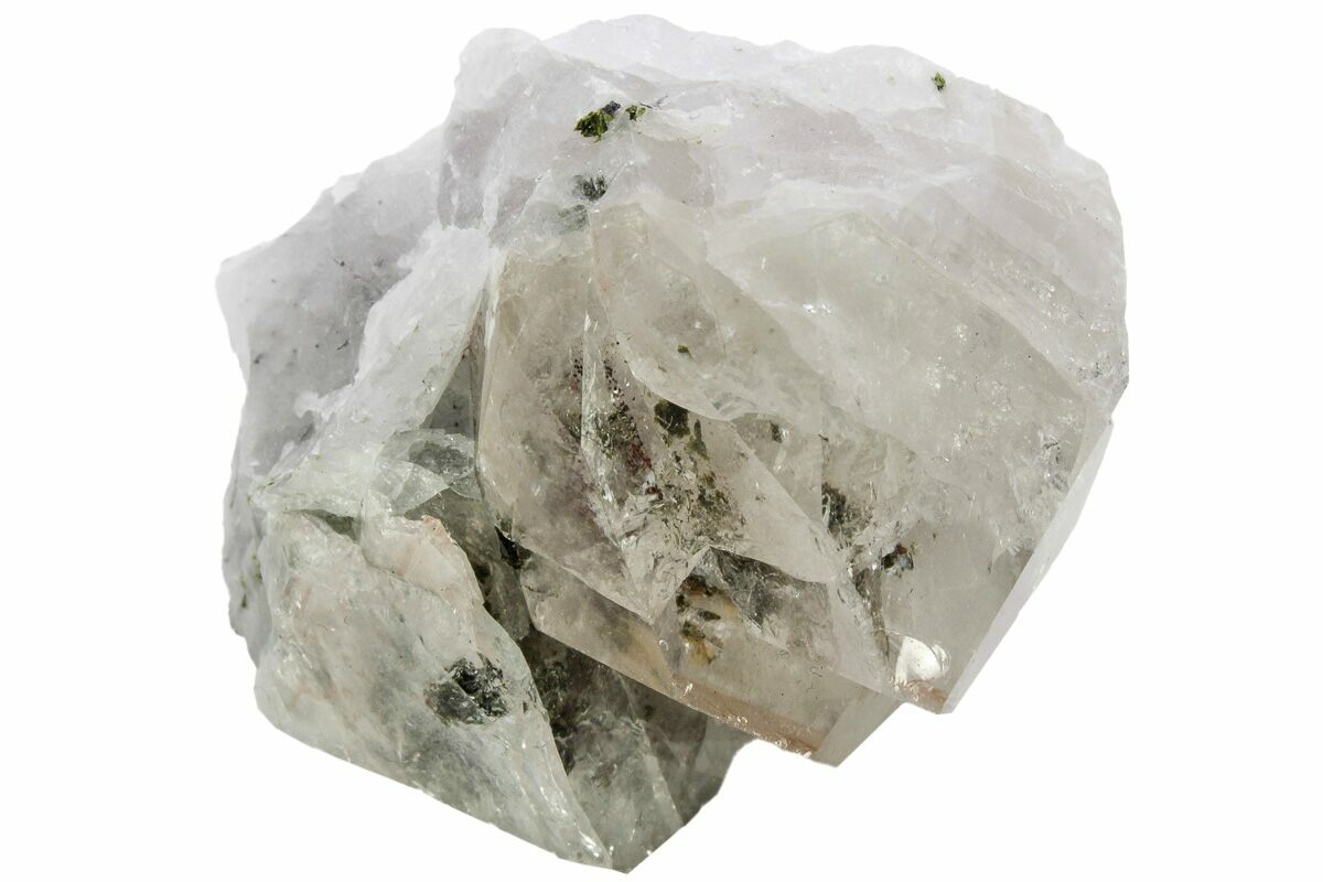 This is a beautiful, 1.9" wide quartz crystal cluster containing green epidote inclusions scattered throughout the crystals. It comes from the Hongxizhen unnamed mining area in the Sichuan Province of China. The base of this specimen has been cut flat for presentation purposes.