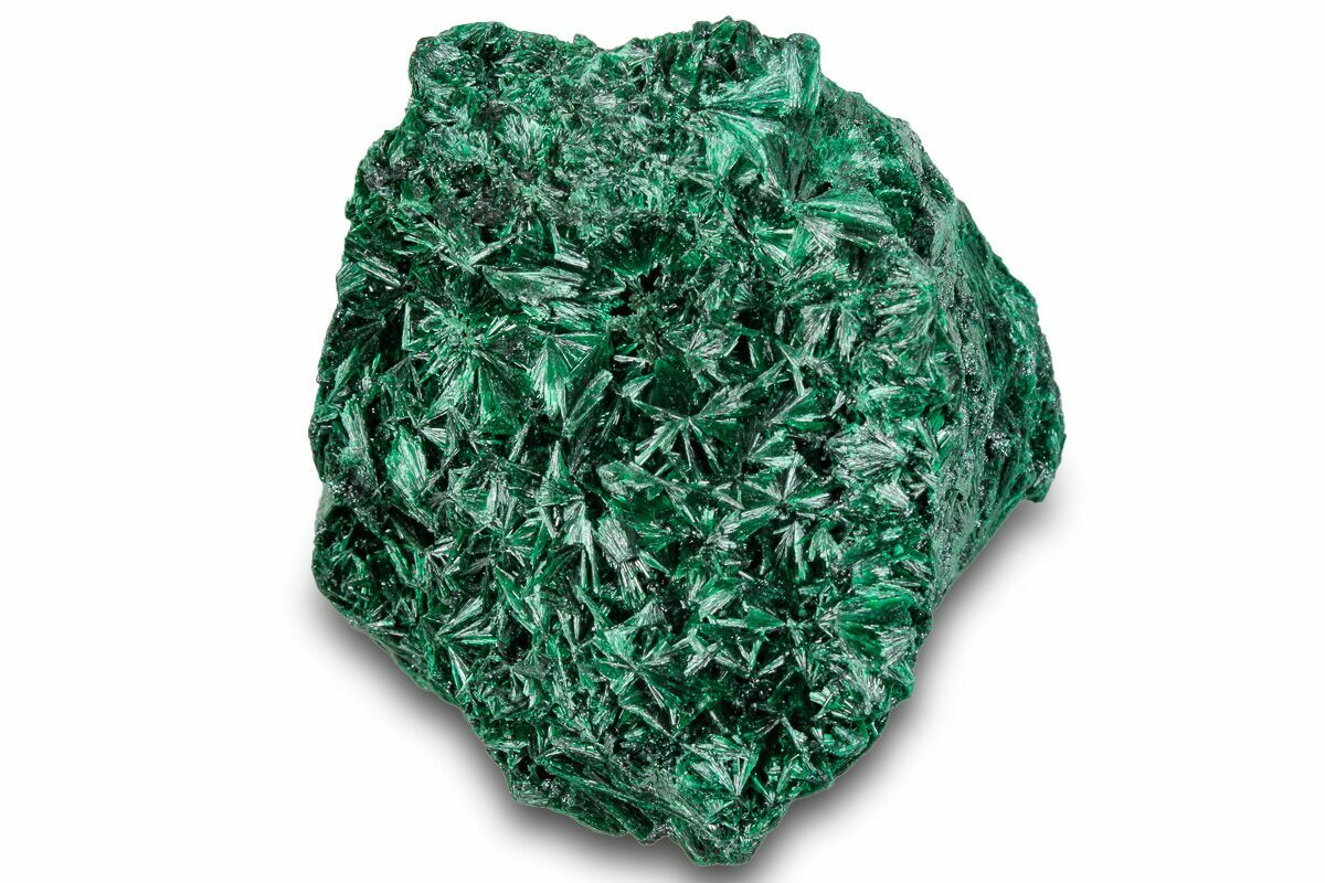 Malachite is an intense green copper-based mineral that can be found in a wide variety of forms. Malachite can grow in botryoidal masses, stalactitic formations, and reniform formations, typically as a tight cluster of fanning fibrous needles that make up a seemingly solid mass. As layers continue to stack during formation, banded patterns can sometimes begin to take shape, explaining the rings in all shades of green seen on most polished malachite specimens.