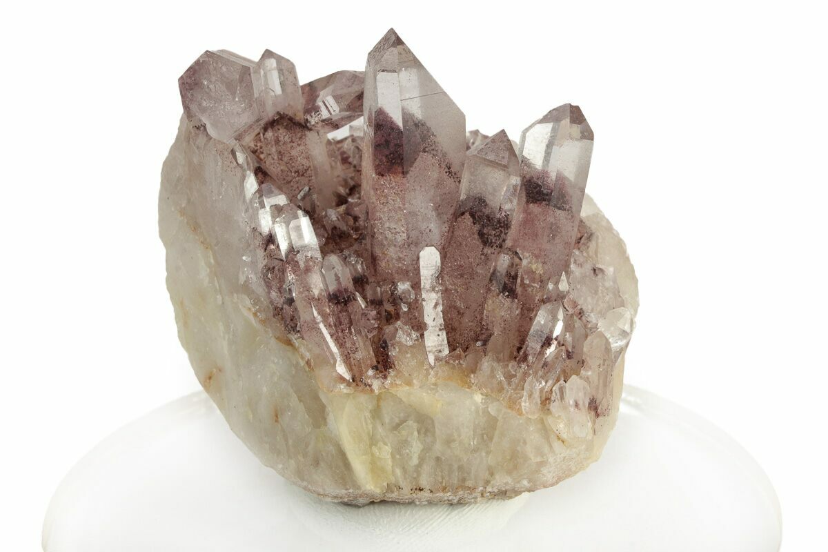 These crystals have hematite phantoms that give them a nice, purple-red colored point within a glassy quartz point. This phenomena is often referred to as sunset phantom quartz, an allusion to the purple coloring in contrast with the orange staining of the crystal base which is attributed to iron oxides.