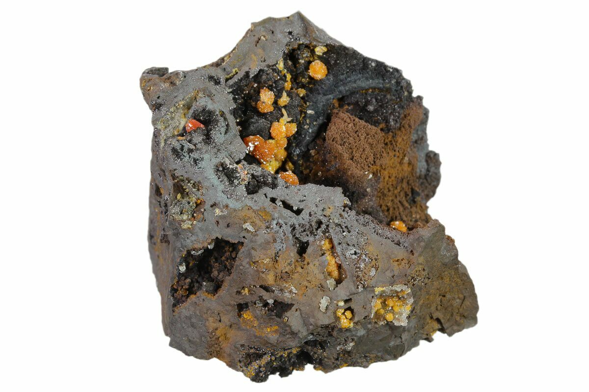 This is a beautiful formation of red-orange vanadinite on botryoidal goethite, collected from the ACIF mine in Mibladen, Morocco.