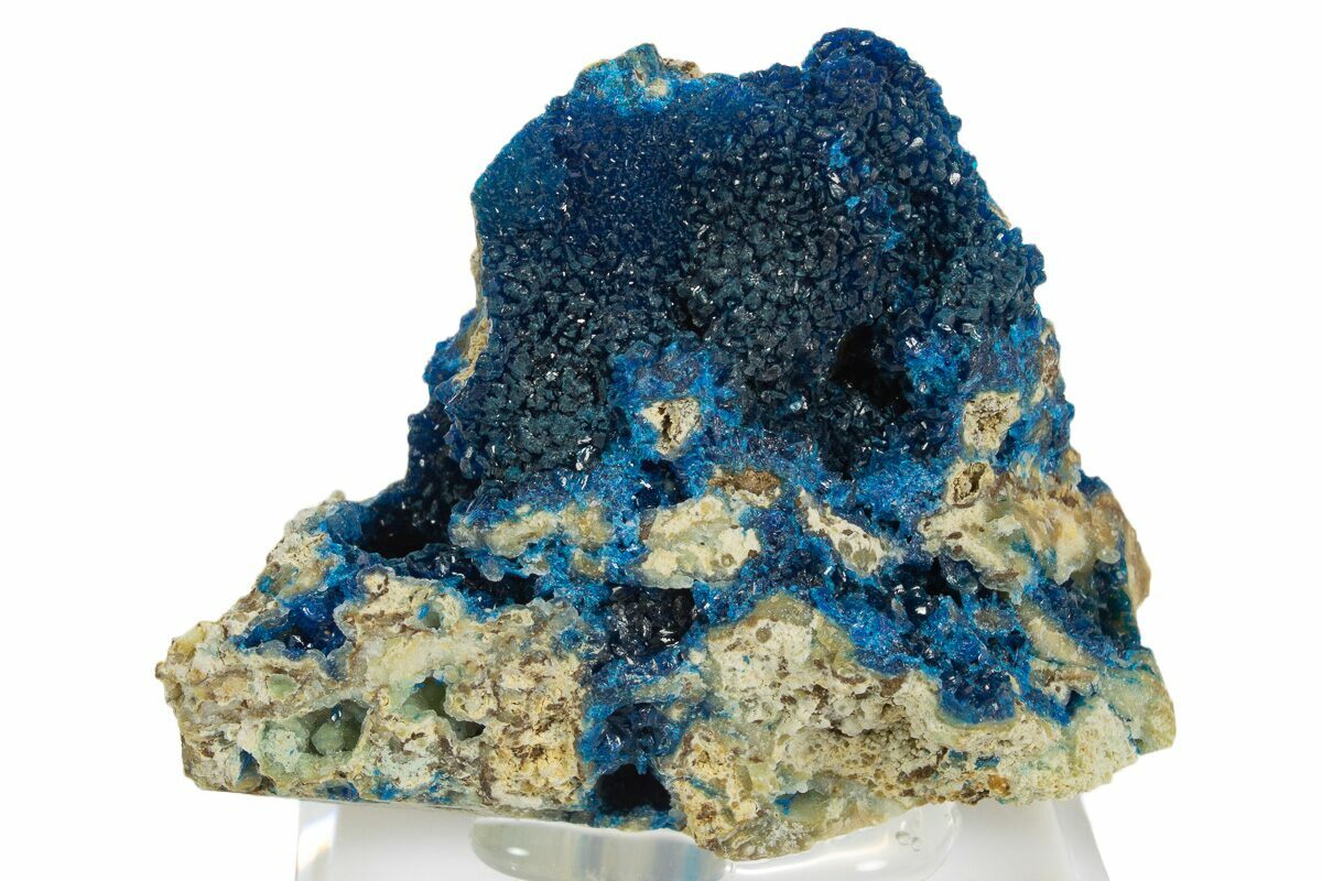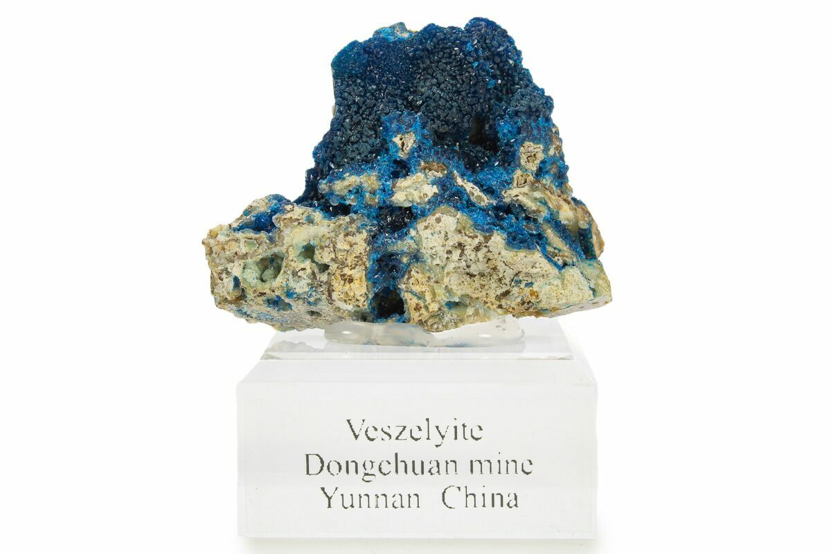 This is a spectacular, 1.9" wide cluster of vibrant blue veszelyite crystals on a bed of globular hemimorphite, collected from the Dongchuan Cu Mine in the Yunnan, China.