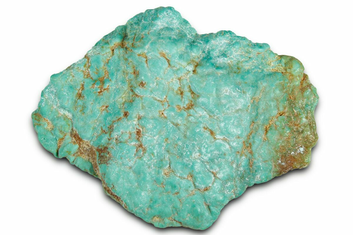 Turquoise is a prized gemstone known for its captivating shades of blue to green, formed through the interaction of copper, aluminum, and phosphate in arid, mineral-rich environments. Throughout history, it has been valued by many cultures for its beauty and rarity. Chilean turquoise, though less widely known than material from regions like the American Southwest or Iran, offers its own distinctive appeal. It is primarily mined in northern Chile, particularly in the Atacama Desert near cities like Copiapó and Ovalle, where copper mining is abundant. This turquoise often exhibits vivid blue to blue-green tones, frequently accented by striking veins of brown, black, or golden matrix. Its bold coloration and earthy character make Chilean turquoise a unique and sought-after variety among collectors and jewelry artisans alike.