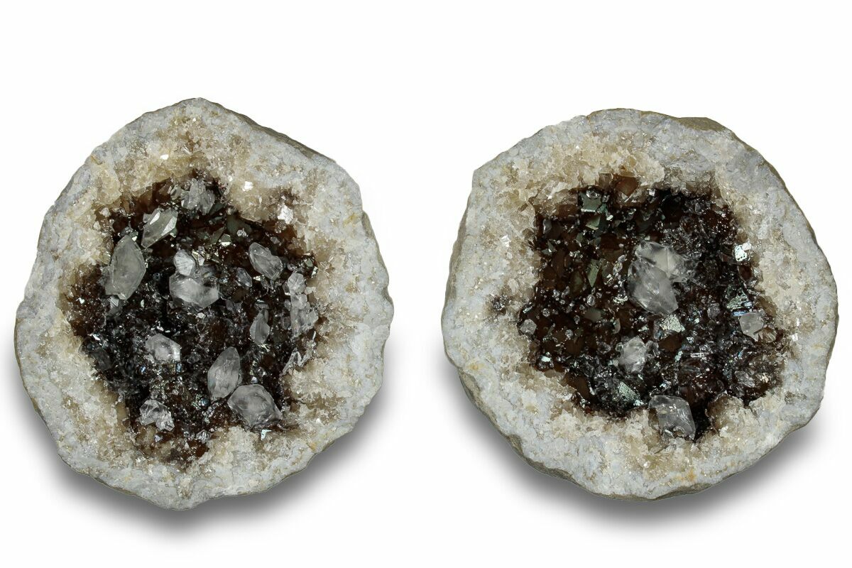 This is a sparkling 1.95" wide keokuk geode collected from Lewis County, Missouri. It has been cracked open to reveal an interior lined with pearly clear and iridescent, deep brown calcite crystals. Both halves are included with this purchase.