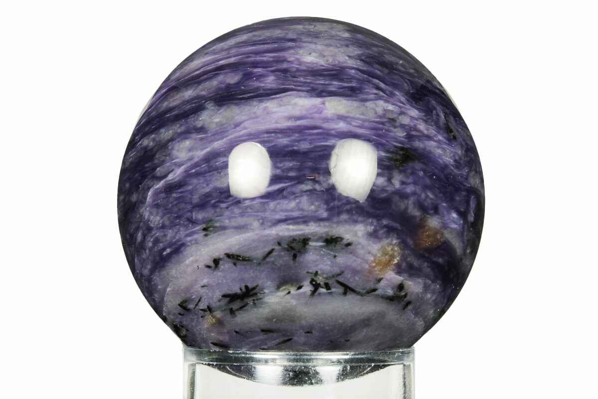 This is a beautiful polished charoite sphere from Siberia, Russia. It measures 1.95" in diameter and has been polished to a glossy finish. Comes with the pictured display stand.