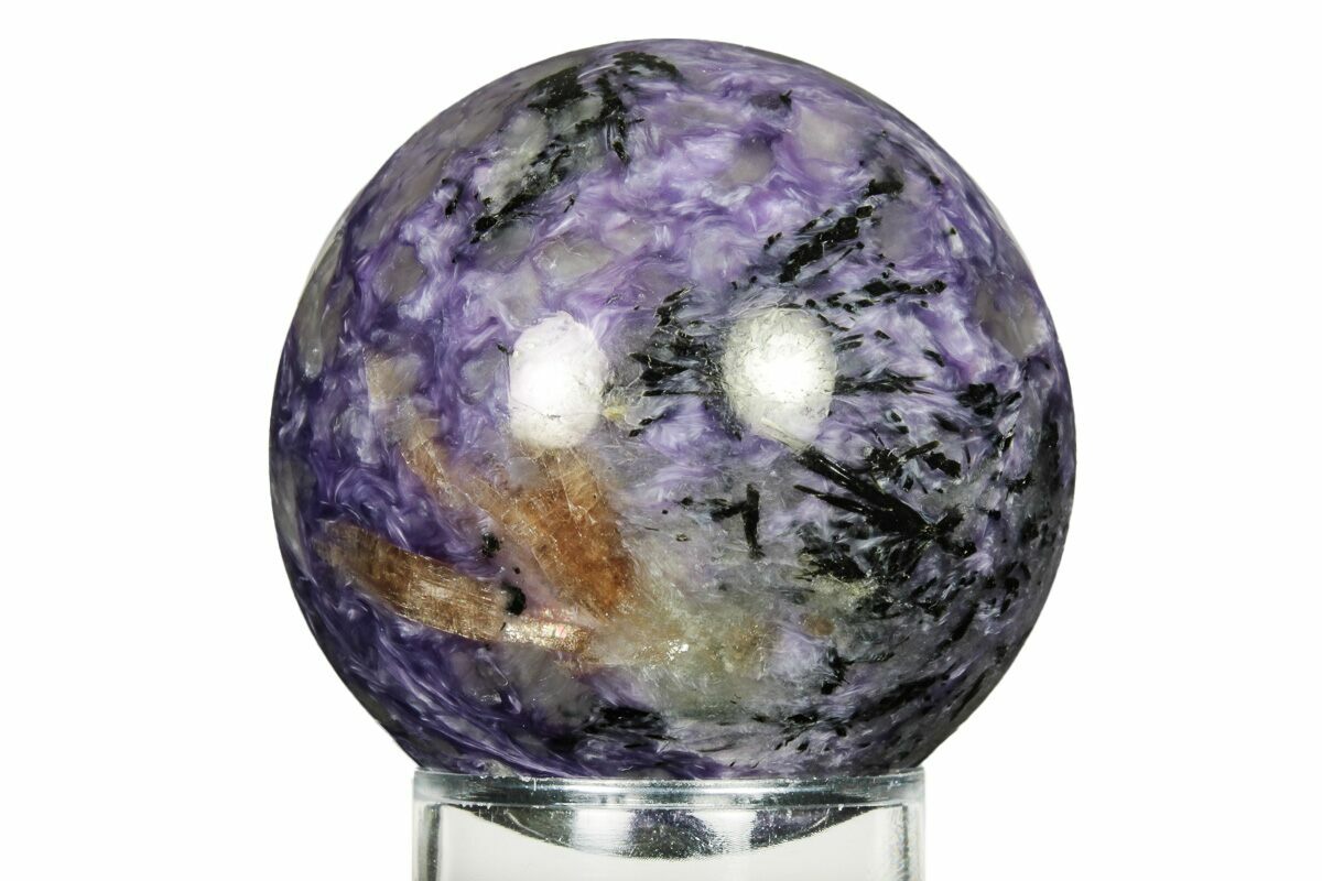 This is a beautiful polished charoite sphere from Siberia, Russia. It measures 1.95" in diameter and has been polished to a glossy finish. Comes with the pictured display stand.