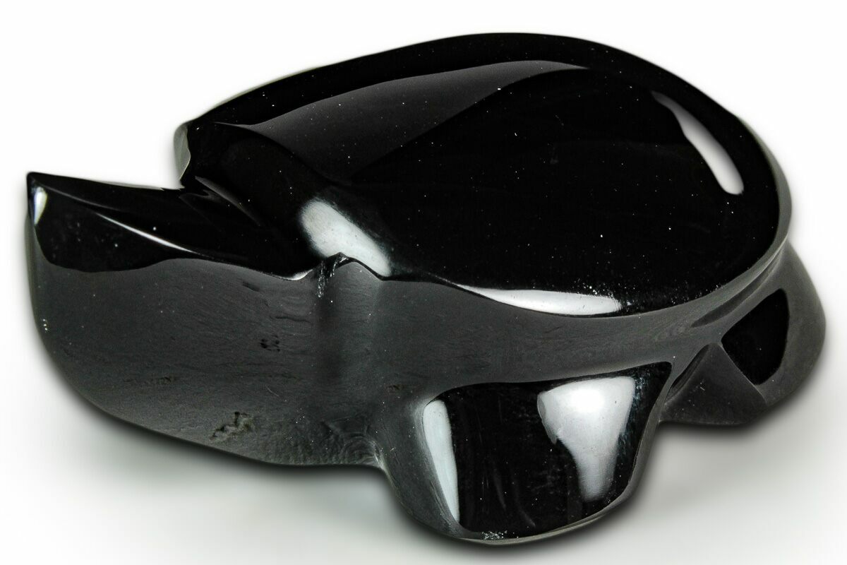 This is a 1.95" long turtle sculpted from rainbow obsidian. This interesting stone is mined near Davis Creek in Northern California. The obsidian exhibits a colorful chatoyant effect that changes when viewed from different angles. A beautiful purple color can be seen on the top of the turtle when placed under a light source.
