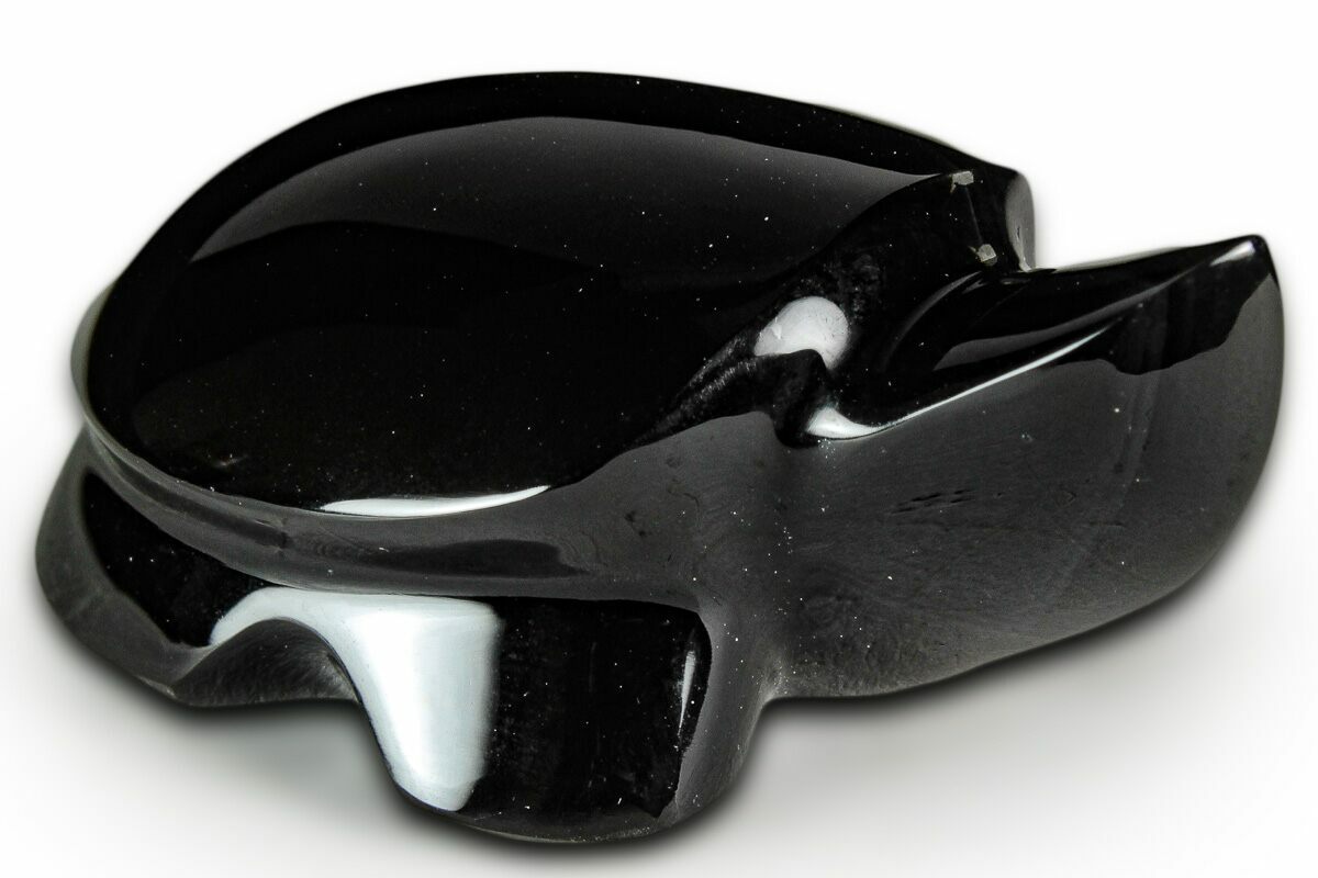 This is a 1.95" long turtle sculpted from rainbow obsidian. This interesting stone is mined near Davis Creek in Northern California. The obsidian exhibits a colorful chatoyant effect that changes when viewed from different angles. A beautiful purple color can be seen on the top of the turtle when placed under a light source.