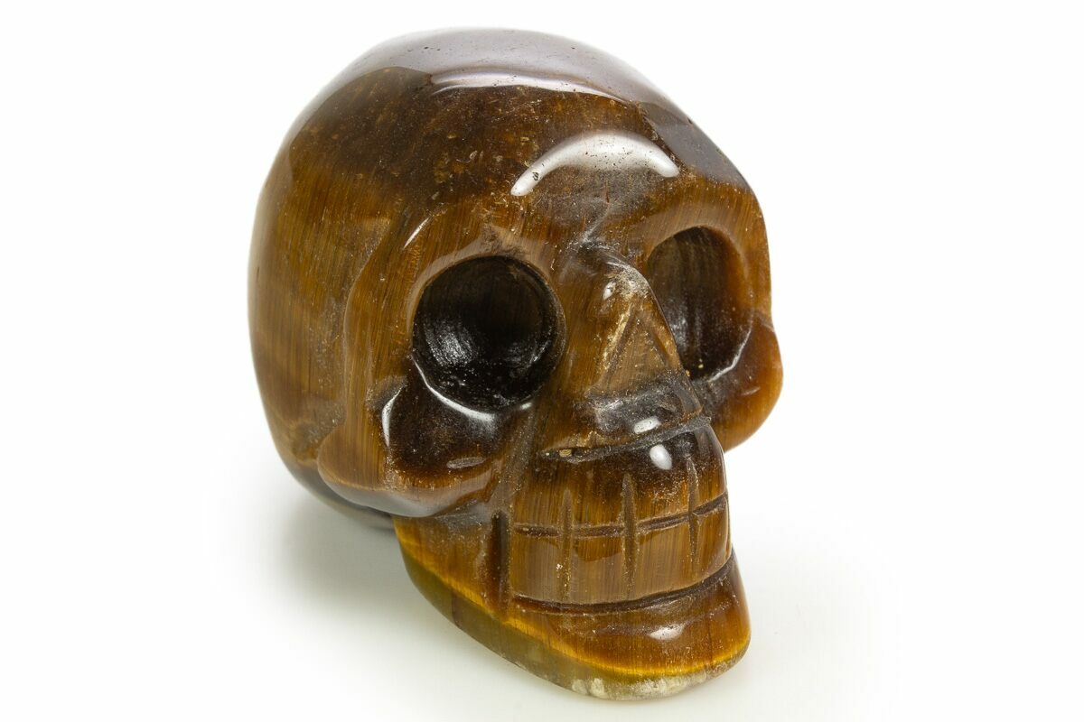 This is a beautiful, 1.95" wide skull, crafted from chatoyant tiger's eye from South Africa. The entire specimen has been polished to a glossy finish. A fun specimen to add to any collection!