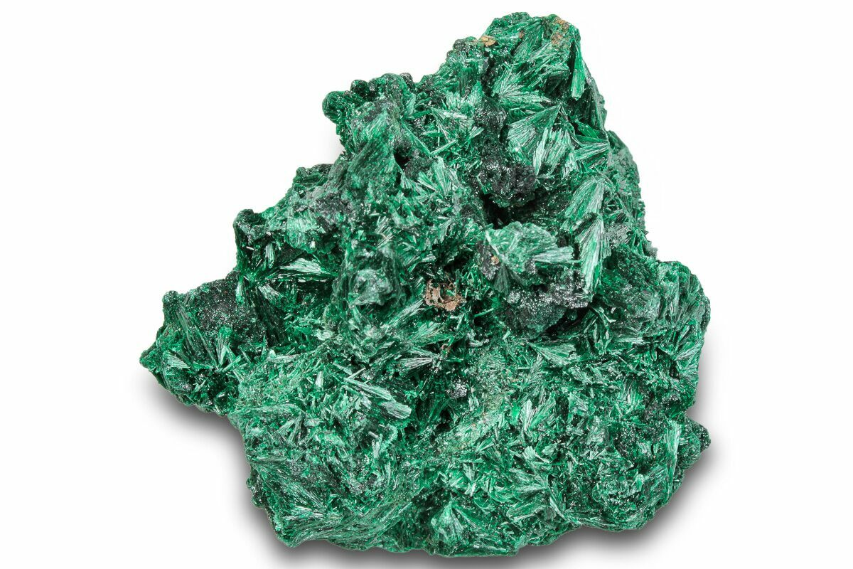 Malachite is an intense green copper-based mineral that can be found in a wide variety of forms. Malachite can grow in botryoidal masses, stalactitic formations, and reniform formations, typically as a tight cluster of fanning fibrous needles that make up a seemingly solid mass. As layers continue to stack during formation, banded patterns can sometimes begin to take shape, explaining the rings in all shades of green seen on most polished malachite specimens.