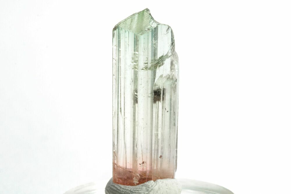 This is a gem quality, 1" long, bi-colored elbaite tourmaline crystal that was collected from the Rubaya mining sites in Democratic Republic of the Congo. The base of the crystal has light-pink coloration which then transitions to colorless, and then to a faint-green at its termination.
