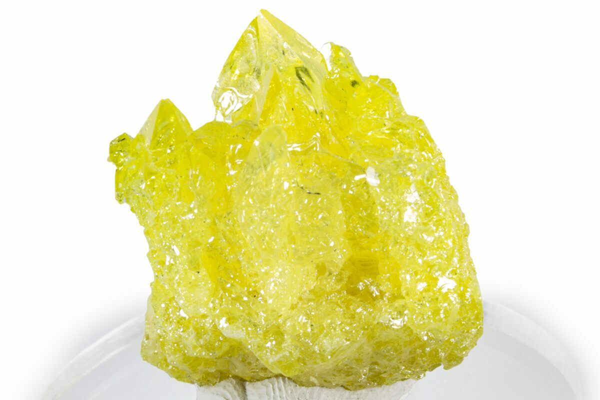 Because sulfur is a soft and temperature-sensitive mineral, proper care is important. The crystals can fracture if subjected to sudden heating or cooling, so they are best stored in a stable environment away from direct sunlight, heat sources, or abrupt temperature fluctuations. With gentle handling, these Bolivian sulfur specimens remain brilliantly vibrant and make an impressive addition to any mineral collection.