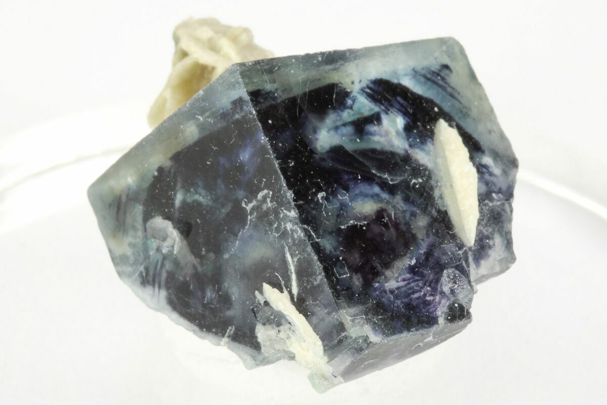 This is a gorgeous fluorite crystal with excellent clarity, that formed in association with bladed calcite crystals. The crystal contains intense purple and blue phantoms, along with a quartz crystal that protrudes outward from the fluorite. It was collected from the Yaogangxian Mine in the Hunan Province of China. Under short-wave ultraviolet light, this crystal exhibits a vibrant purple fluorescence.