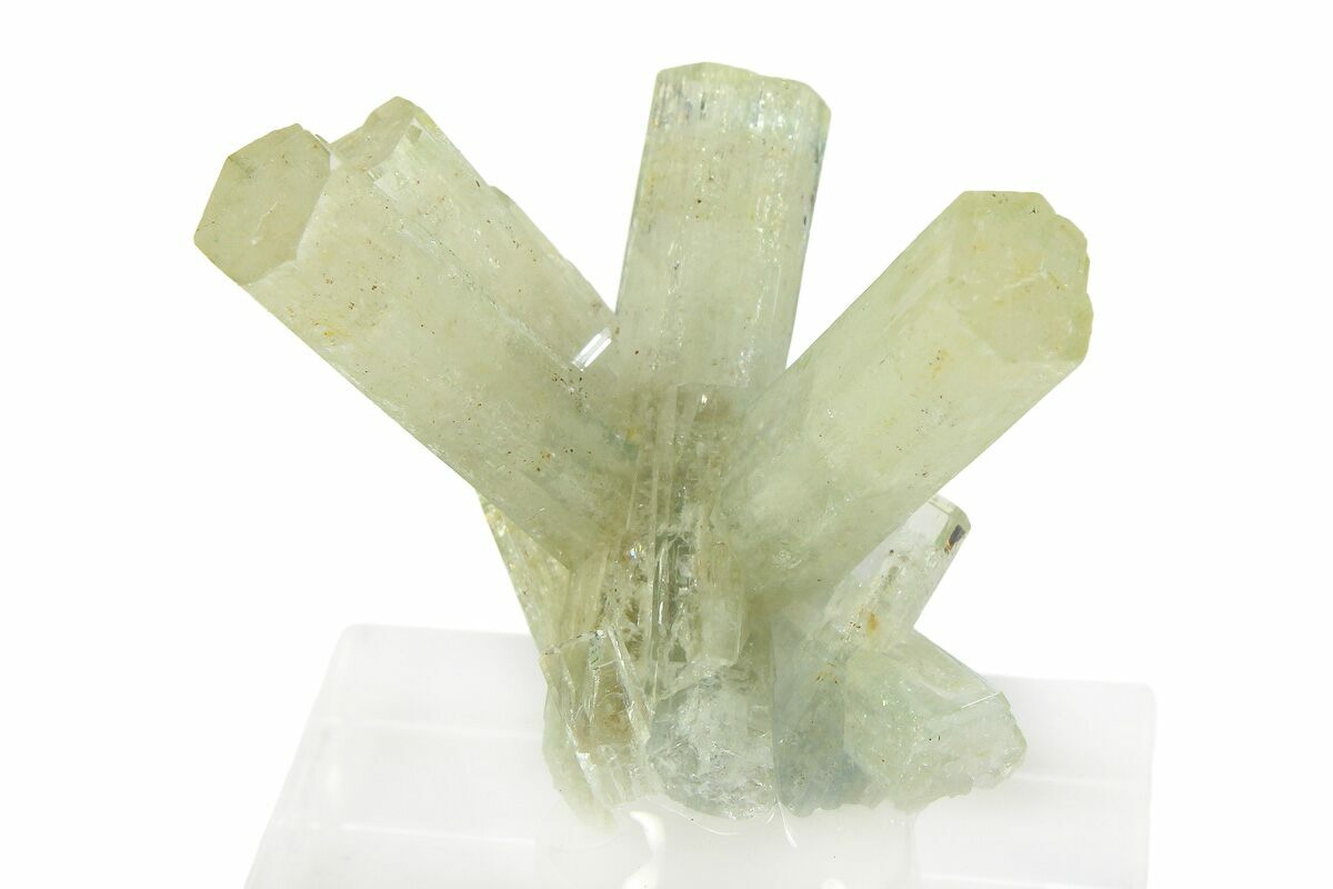 This is a beautiful 1" wide cluster of goshenite crystals from the Erongo Mountains of Namibia. All of the crystals exhibit an exceptional luster and pristine terminations. The specimen has been mounted to an acrylic display base.