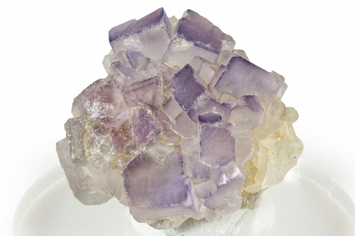 This 1" specimen features purple fluorite crystals from the mines near Chiapas, Mexico. The crystals are predominantly cubic with darker purple coloration at the edges of many of the cubes. It has been mounted to an acrylic display base with mineral tack.