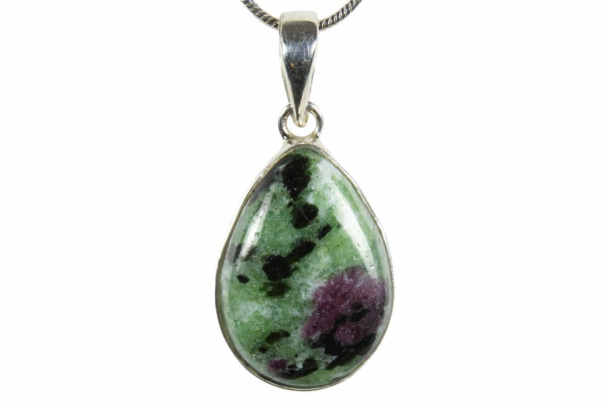 This is a colorful ruby zoisite pendant featuring a beautiful, polished ruby zoisite stone set in 925 sterling silver. The pendant itself is 1" tall (including loop). A 24" silver plated chain with a lobster clasp is included with the pendant.