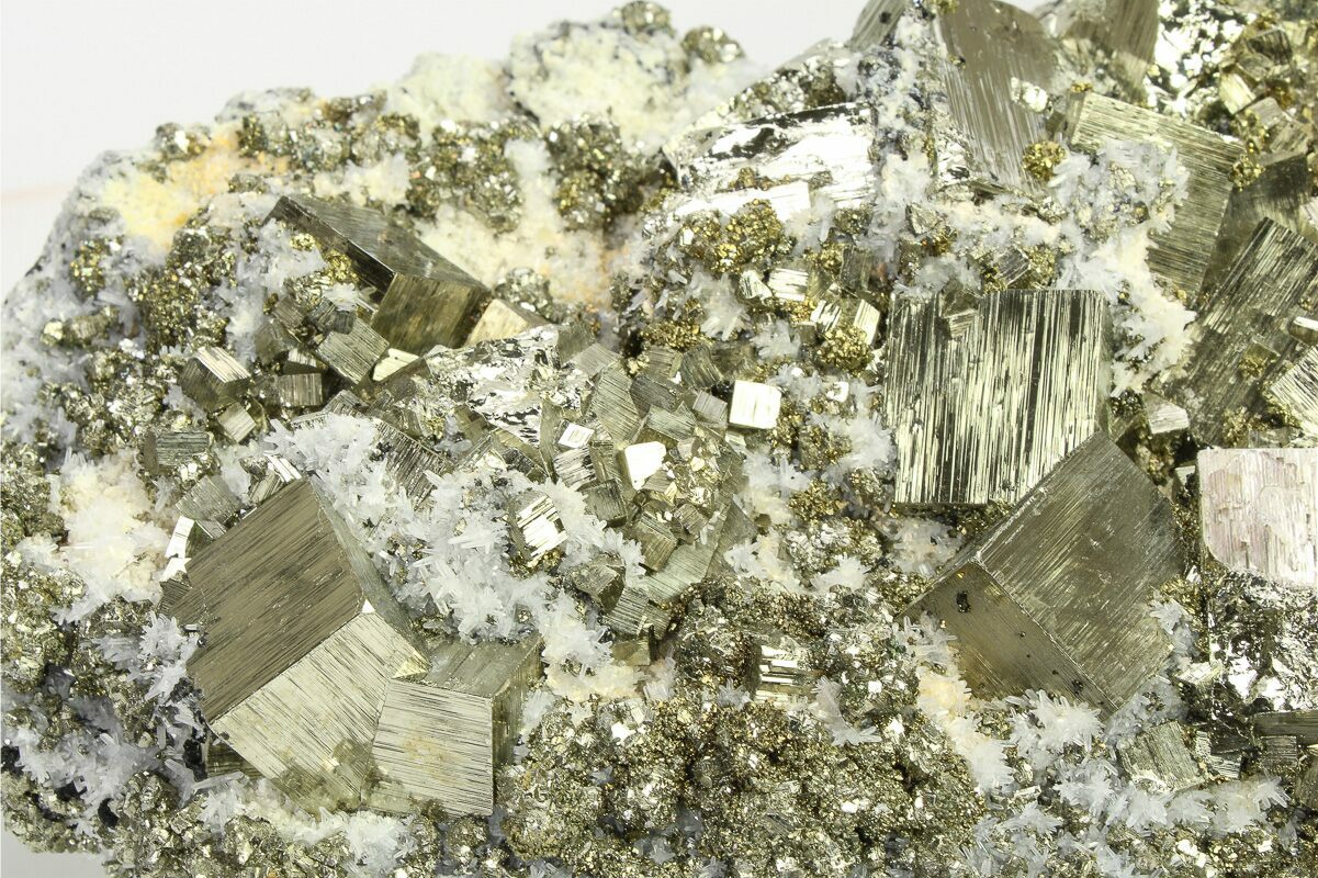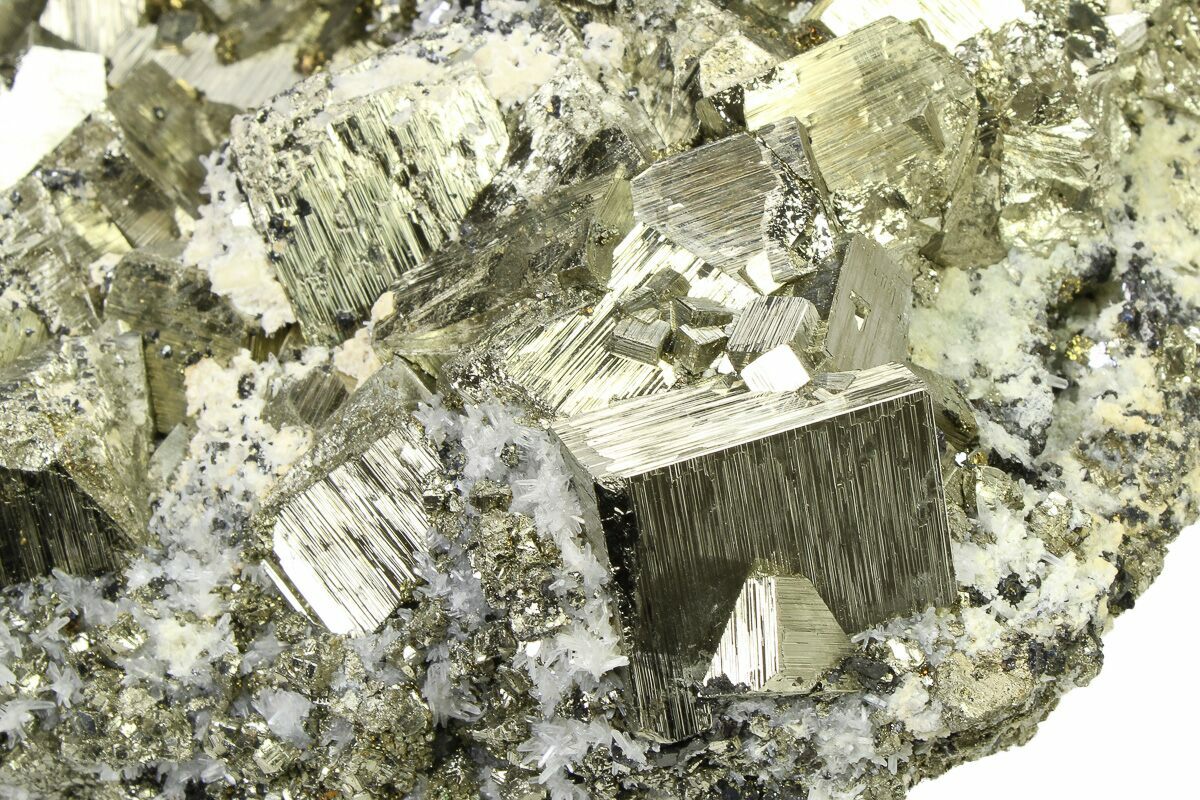 This is a huge cluster of bright, striated cubic pyrite crystals formed in association with quartz crystals, small black sphalerite crystals, and brassy chalcopyrite aggregations. It was collected from the Huanzala Mine in Peru. The entire specimen measures 10.3" wide and weighs just over 10 lbs.