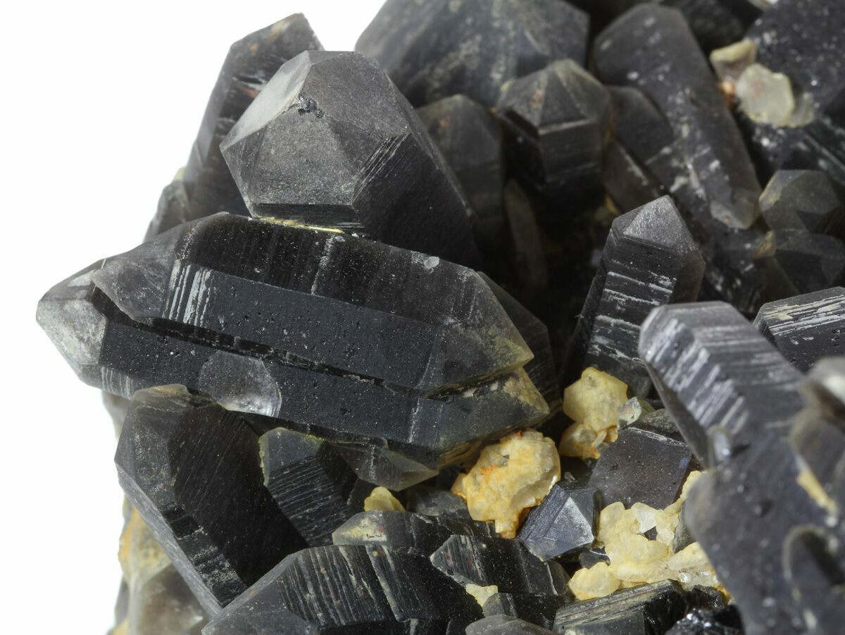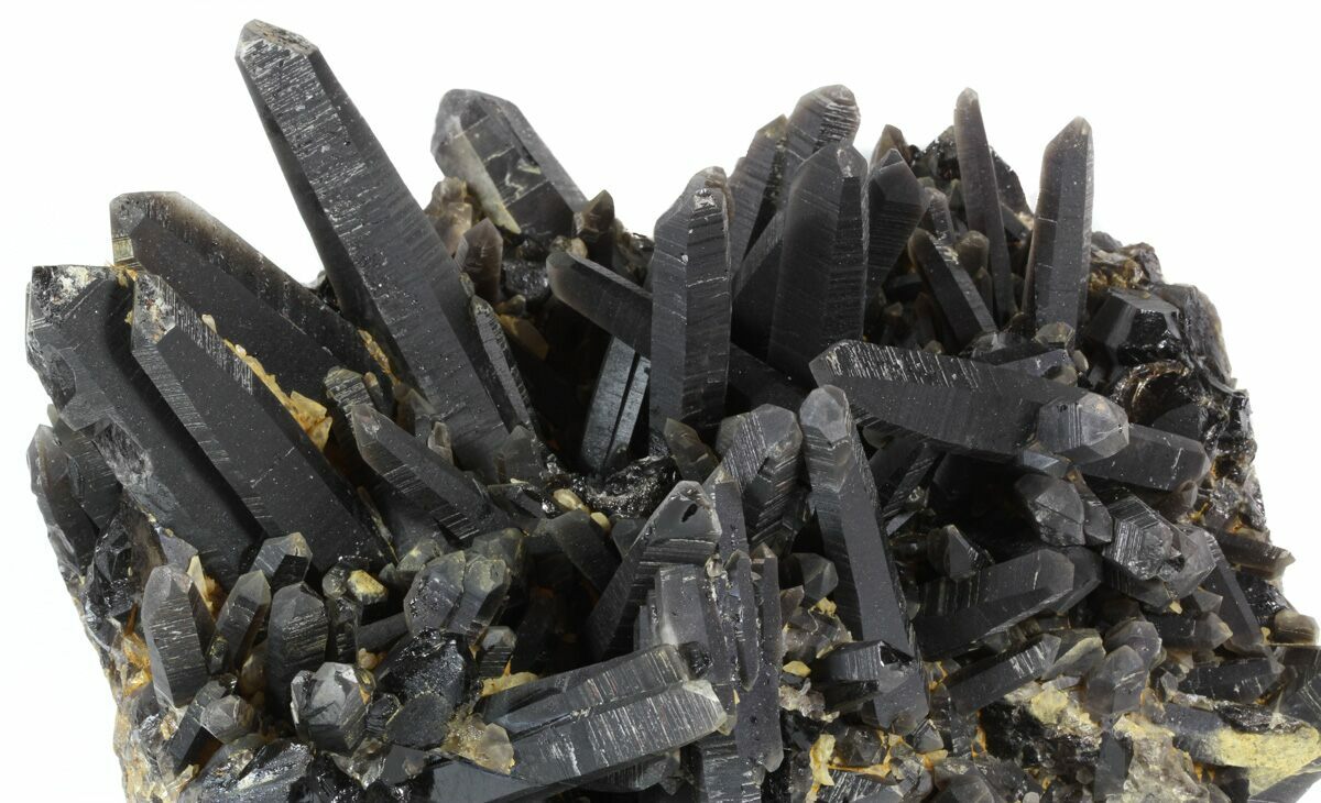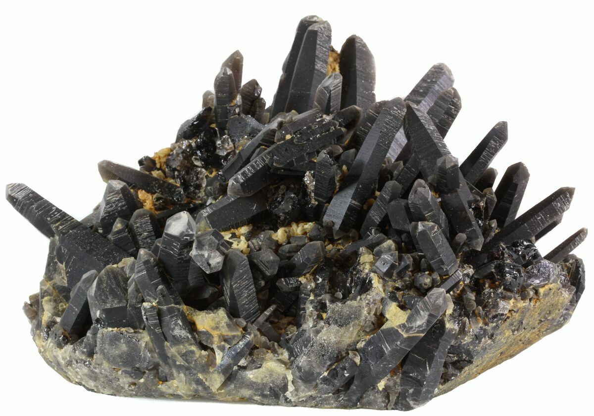 This is an epic cluster of dark black, smoky quartz crystals from Brazil. The entire plate is 10.4 inches wide and the longest point is over 5 inches long. There are small, honey-yellow calcite crystals in between many of the points. Excellent quality crystals with great terminations and very little chipping. The black coloration goes all the way down to the granite matrix. It has not been heated or treated to change the natural color.
