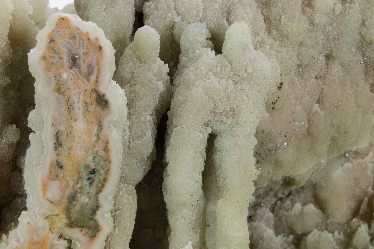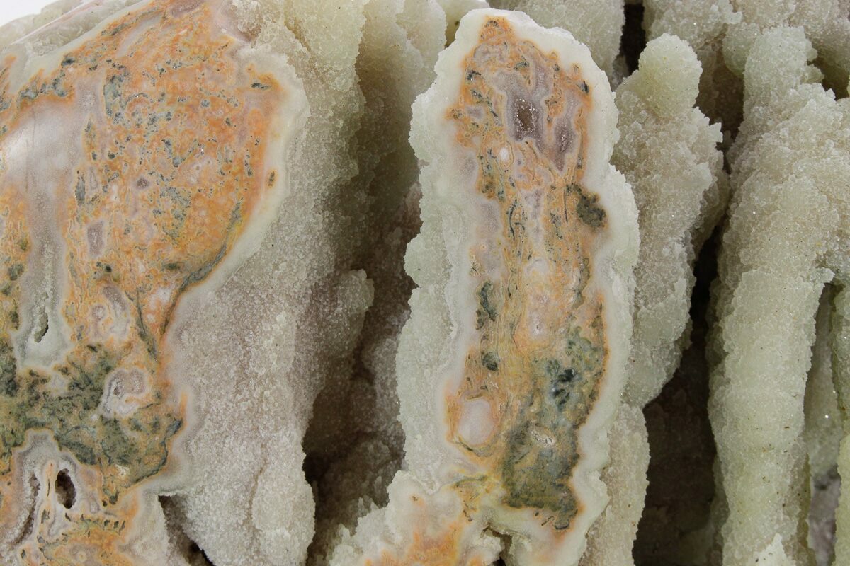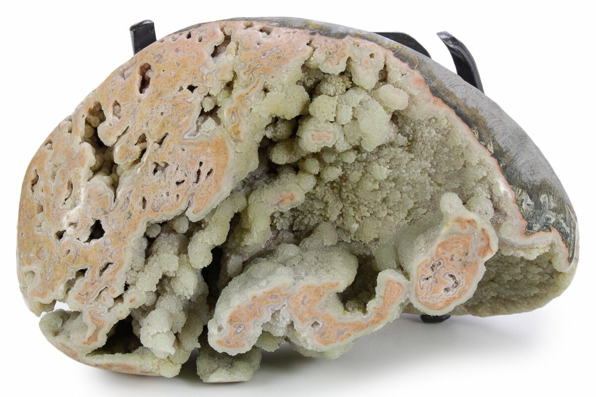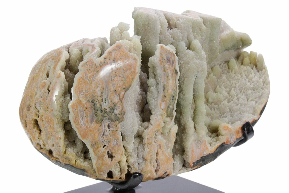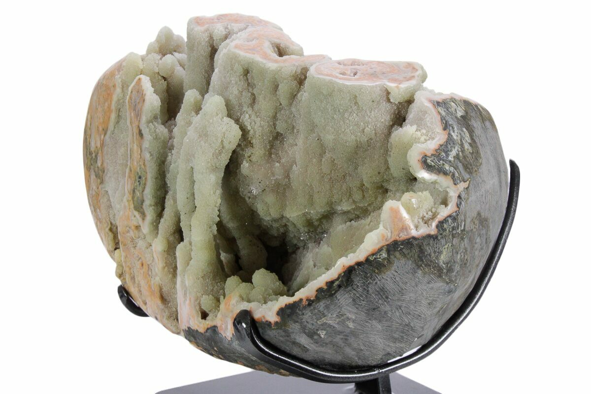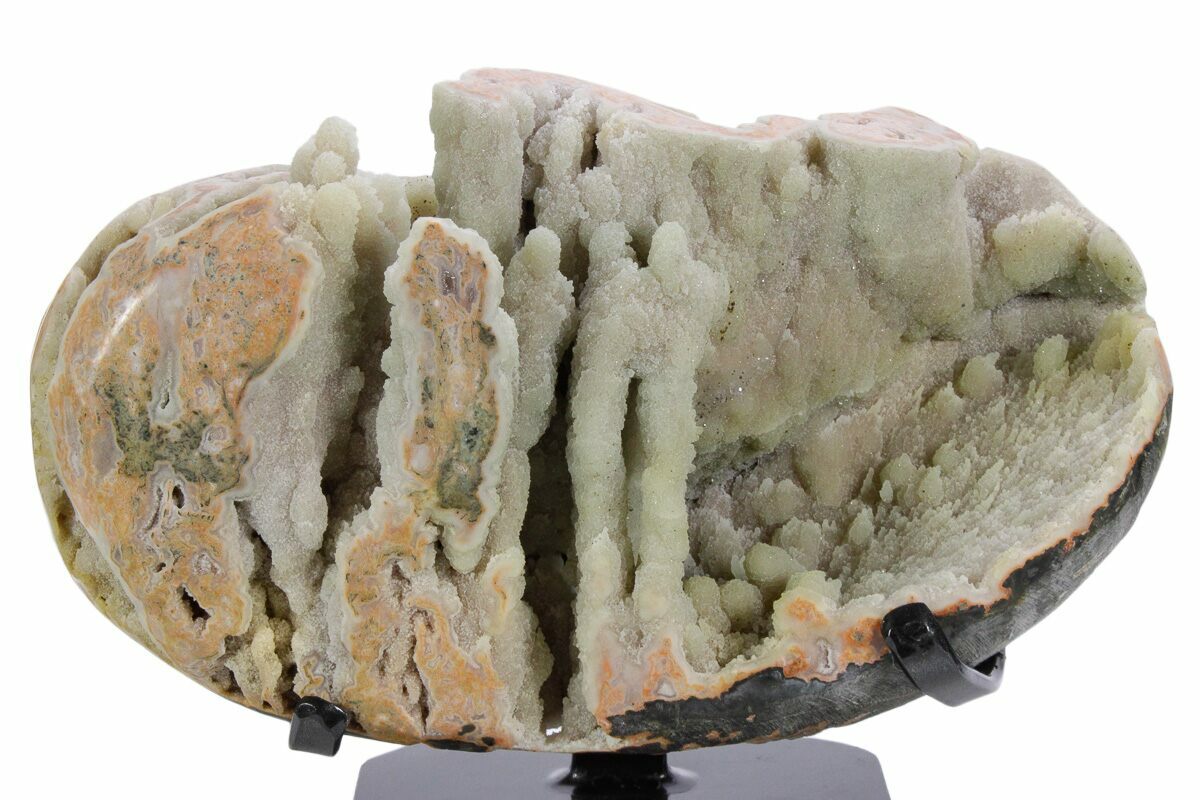 This is a gorgeous druzy quartz geode section from the famous amethyst mines near Artigas, Uruguay. In addition to the beautiful druzy formations, this specimen features a dreamy light green color that really sets this piece apart. Part of the "rind" has been polished to reveal the underlying peach-colored, fibrous mineral aggregations encrusting the basalt matrix.
