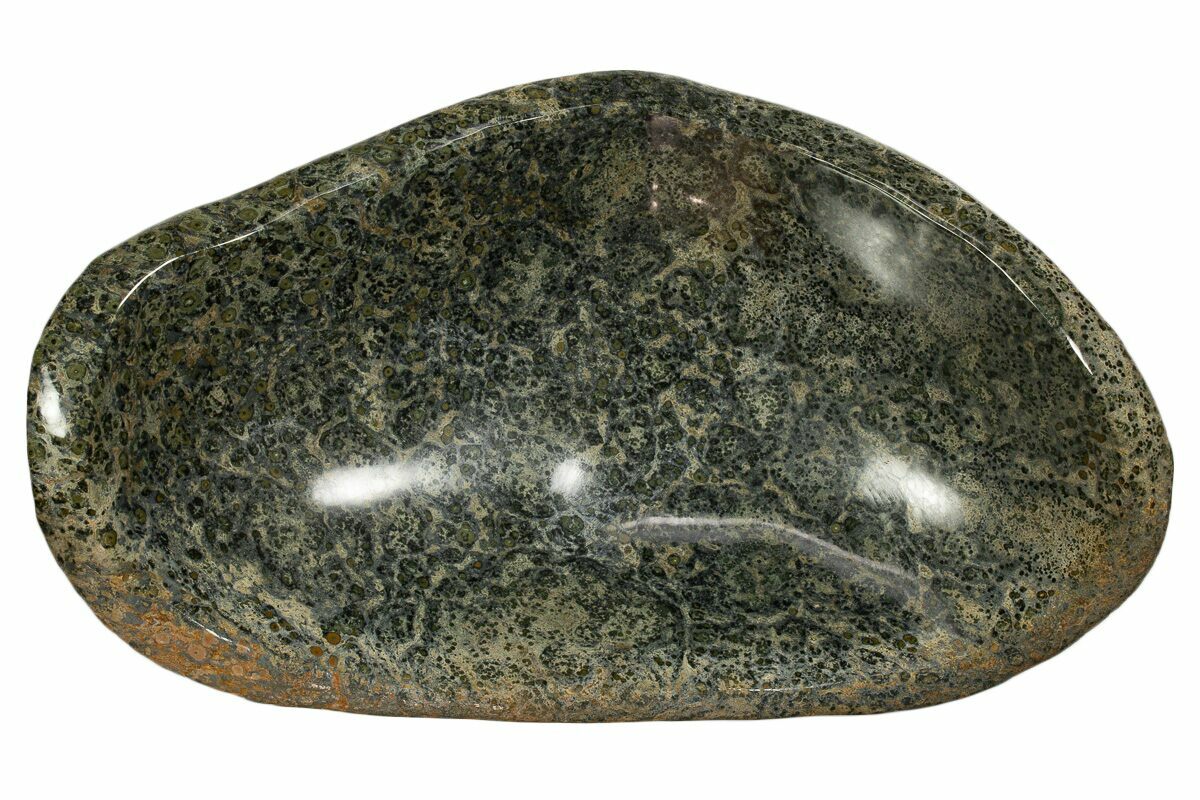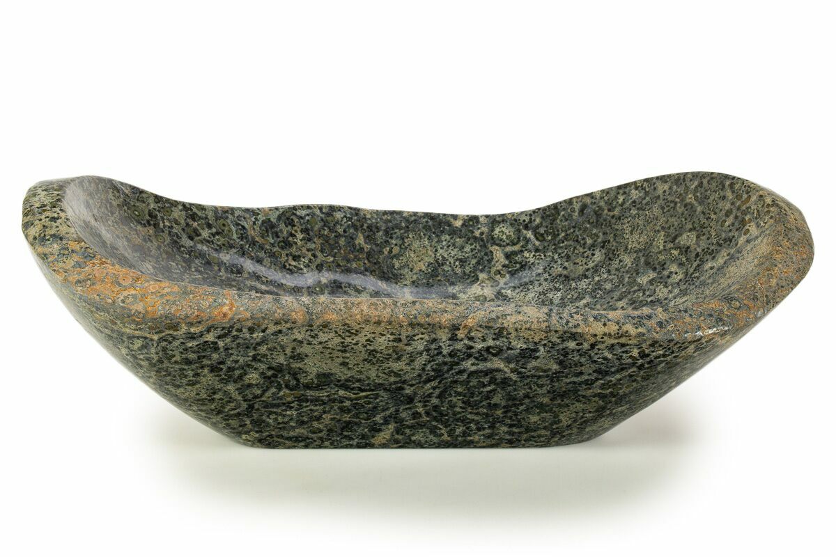 This is a gorgeous, hand polished bowl made from Kambaba jasper found in Madagascar. It is 10.8" wide and has dark circular mineral formations throughout the "jasper".