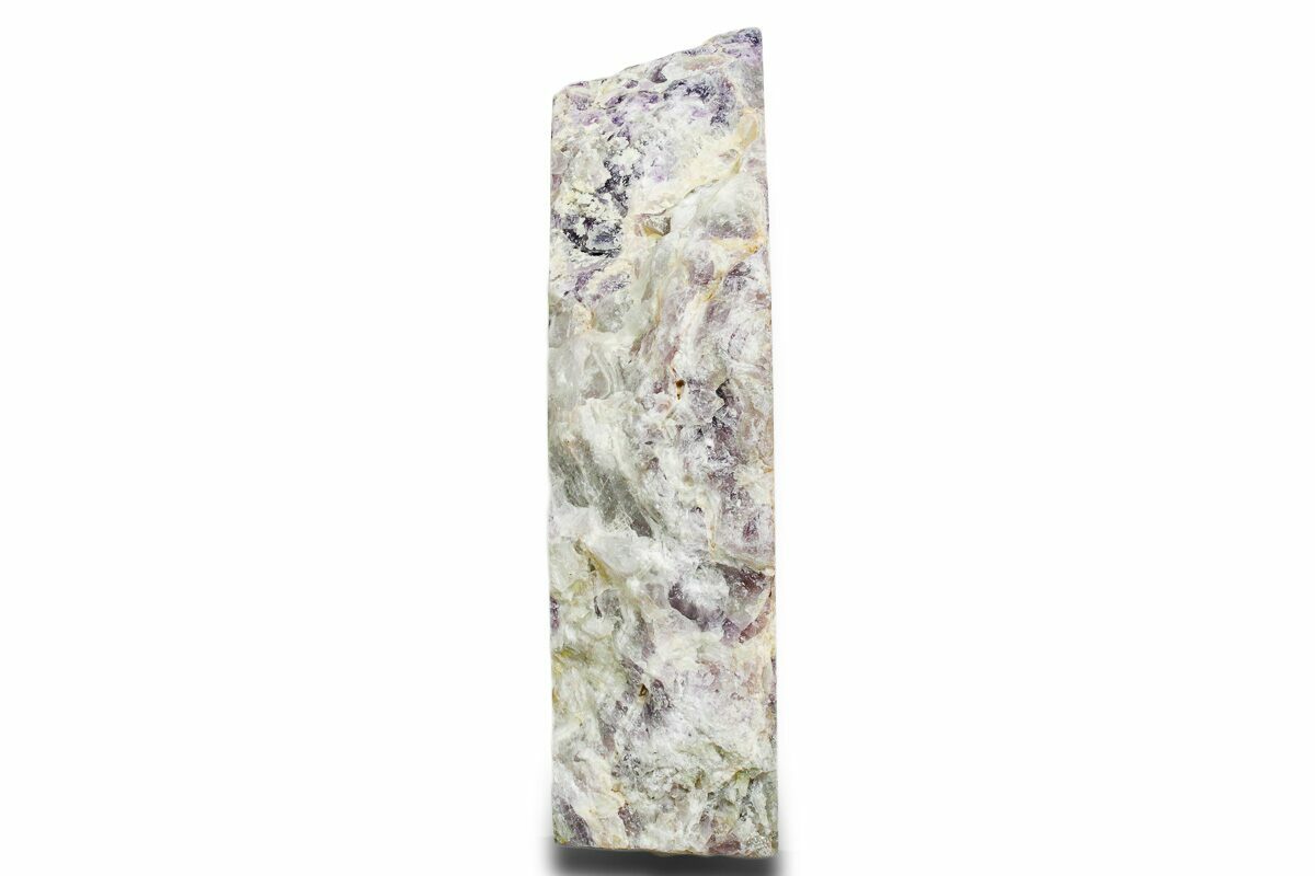 This is a beautiful, 10" tall, free-standing sculpture made from a deep-purple amethyst formation known as chevron amethyst, collected in Zambia. It is commonly marketed as zebra amethyst due to its striped pattern. Both sides have been cut flat and one side is polished to a glossy finish. The bottom of the specimen has been cut flat so that it stands nicely on its own.