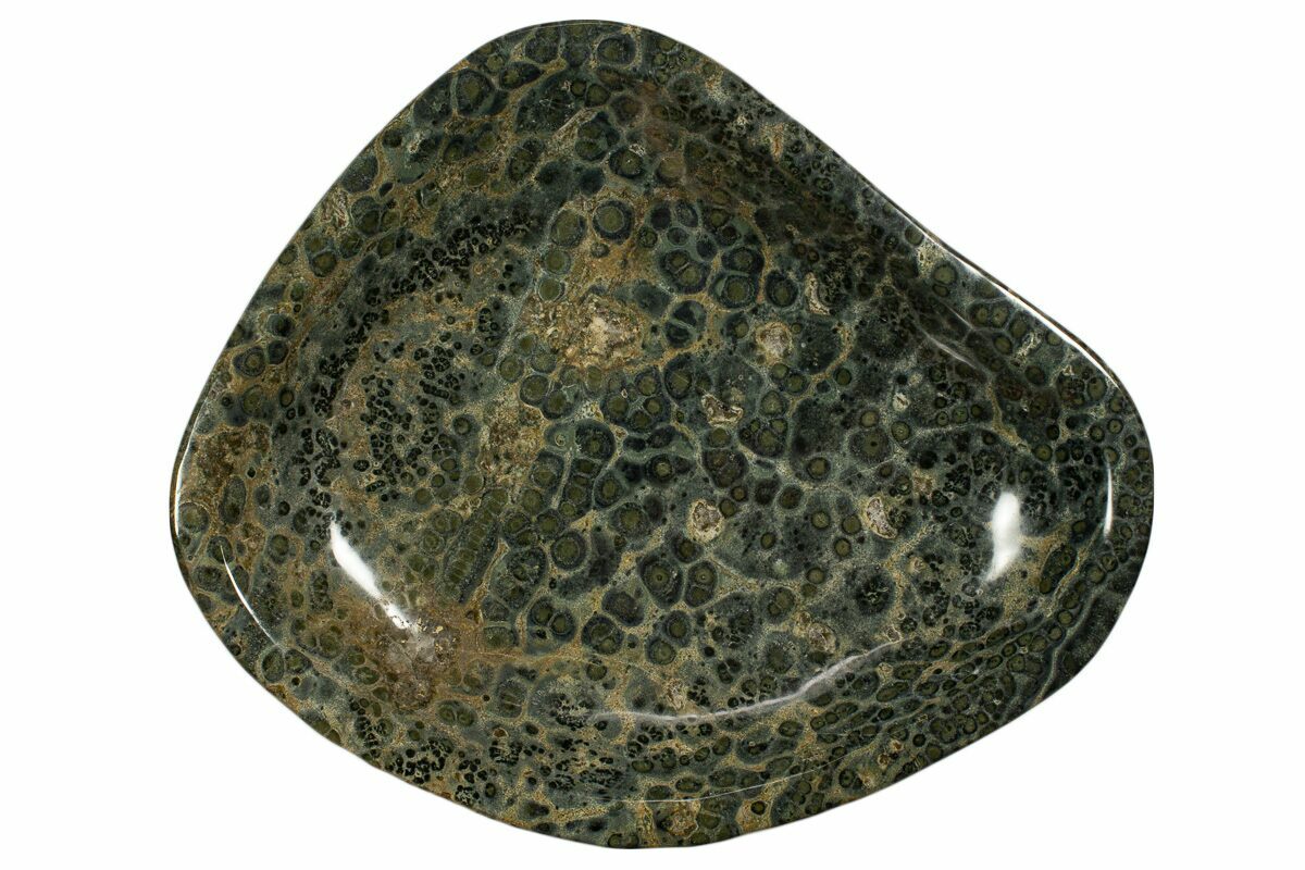 This is a gorgeous, hand polished bowl made from Kambaba jasper found in Madagascar. It is 11.1" wide and has dark circular mineral formations throughout the "jasper".
