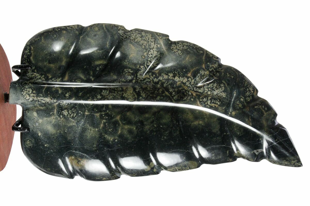 This is a hand polished leaf made from a darker chunk of Kambaba jasper found in Madagascar. It is 11.3" long, has been sculpted into the shape of a leaf. It sits upright beautifully on the accompanied metal and wood display stand.