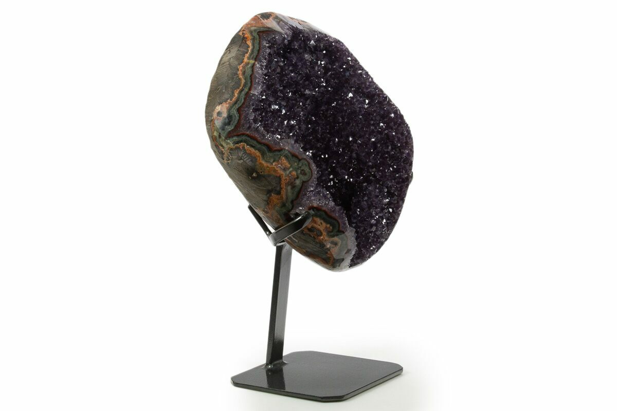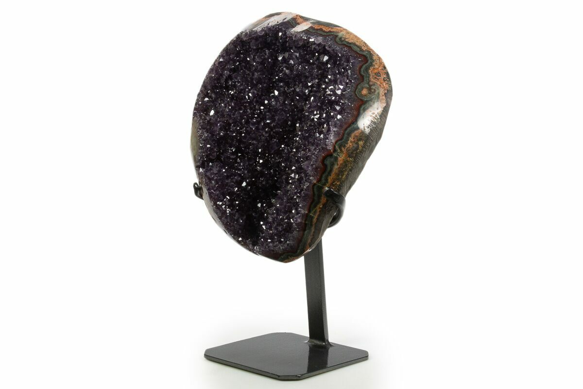 This is an absolutely gorgeous, deep-purple amethyst crystal geode section from the famous amethyst mines near Artigas, Uruguay. It is filled with purple amethyst crystals and the edges have been polished to reveal the underlying layers of colorful agate.