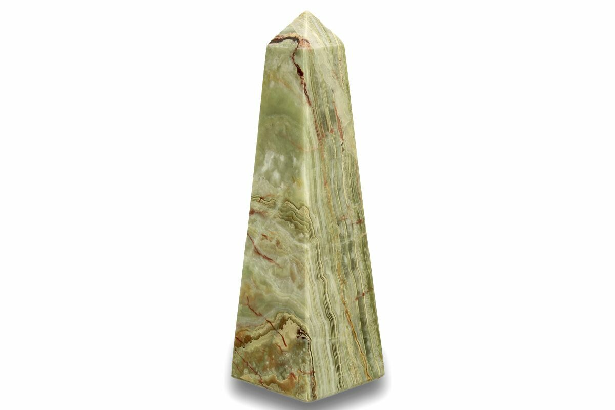 This is a beautiful polished obelisk carved from a kind of calcite often (incorrectly) marketed as Pakistan green onyx. The stone has olive green bands between white, brown, and red banding. It measures 11.6" tall.