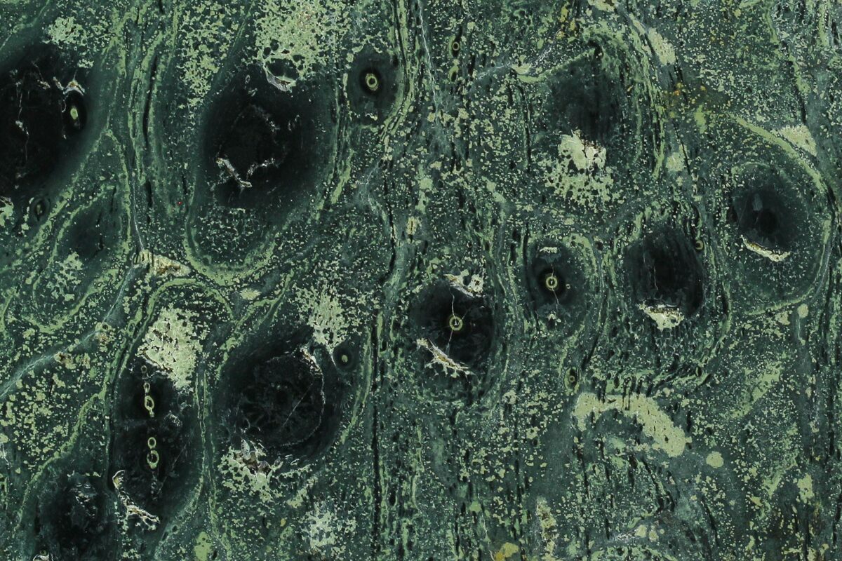 Kambaba jasper—also known in the trade as “crocodile jasper”—is a striking, green-and-black ornamental stone originating from the west-central Bongolava region of Madagascar. Despite the name, it isn’t a true jasper at all, but a rhyolitic volcanic rock that formed from ancient silica-rich lava flows. Its signature appearance comes from swirling green groundmass punctuated by dark, orbicular structures composed of fine amphibole needle aggregates. These orbs can resemble reptilian or amphibian eyes, which is how the nickname “crocodile jasper” arose.