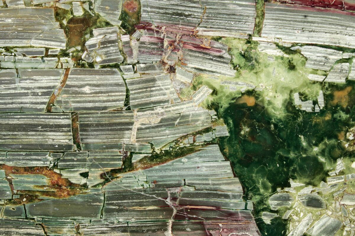 Jasper is a term that can be applied to an opaque variety of chalcedony. The opaqueness is due to a higher concentration of impurities mixed with silica/quartz compared to other varieties of silica, such as quartz or agates. Like agate it may form in a wide variety of colors, and is often multi-colored. In most cases, jasper forms when silica-rich fluids permeate throughout a soft sediment or volcanic debris deposit. The fluids then crystallize around the particles/impurities, resulting in a cementation process. Most often, the impurities present determine the coloration of the deposit following solidification, but other factors can play a role in the color of what is now considered a jasper.