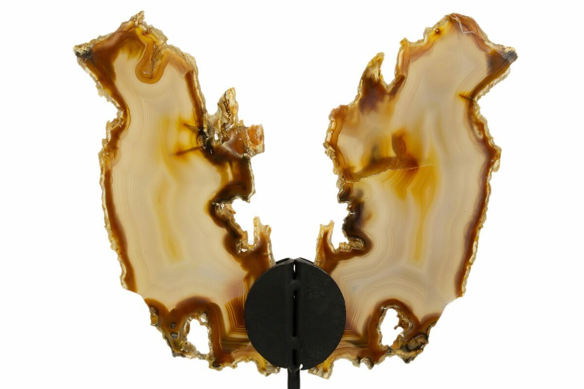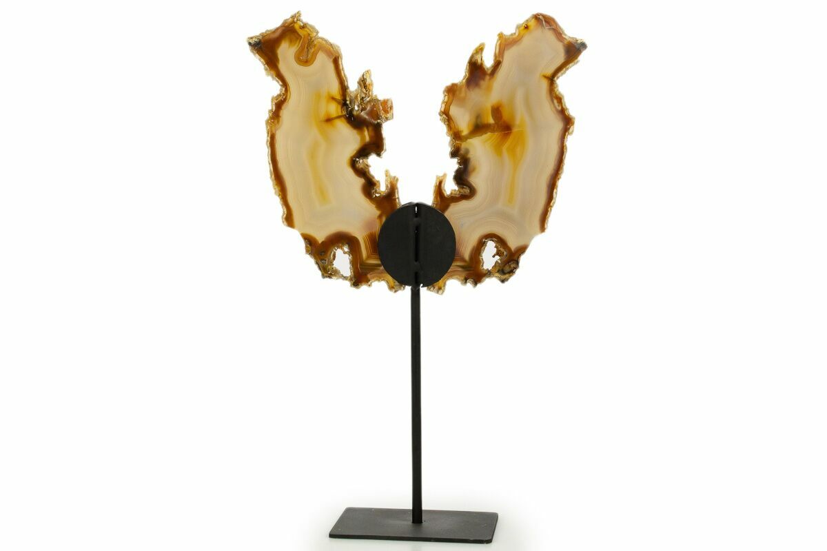 This is a gorgeous Brazilian agate slice pair mounted as "butterfly wings" to create an attractive display. Each agate slice has been cut flat and polished to a glossy finish on both sides. Beautiful banding and coloration on this pair.