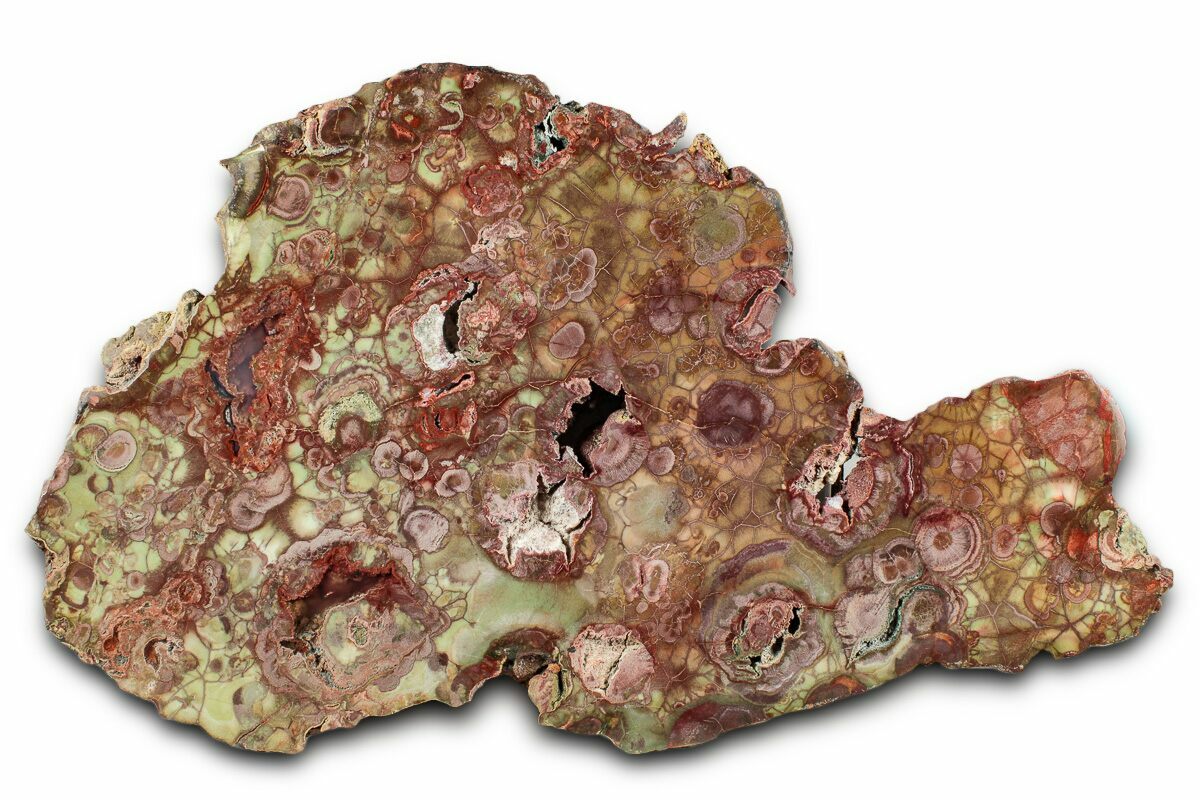 Spiderweb jasper is the name for an olive green and red-brown rhyolite that is found in eastern Oregon. Open cavities can be found throughout this rhyolite, often making the polishing process difficult. Sometimes these cavities are filled with white-colorless or blue agate. It is described as having the appearance of leaves that have fallen onto a spiderweb, likely where the name came from.