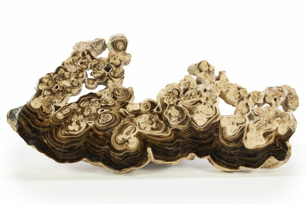 This is a gorgeous, 12.8" wide polished slab of chocolate calcite from Pakistan. The swirling patterns in chocolate calcite from Pakistan are one of its most captivating features. These natural bands twist and flow in layers of rich brown, caramel, and creamy beige, resembling molten chocolate or marbled dessert. Formed through rhythmic mineral deposition over time, the bands reflect subtle shifts in mineral content, pressure, and fluid movement within the host rock. The result is a visually dynamic pattern that appears to ripple across the surface, giving each polished piece a sense of motion and depth. No two are exactly alike, making each specimen uniquely mesmerizing.