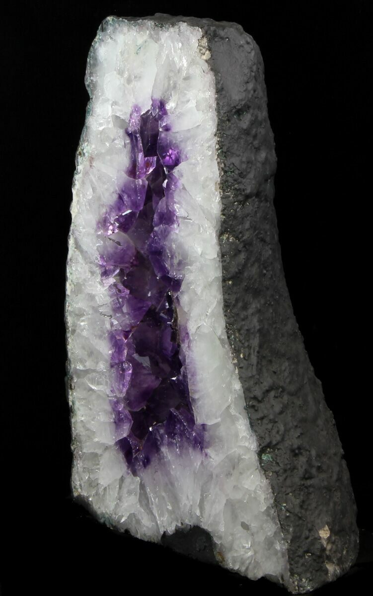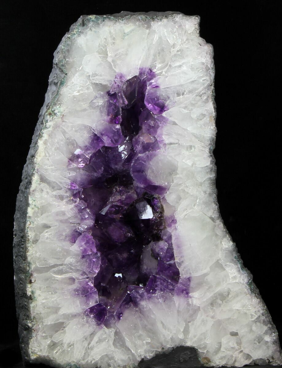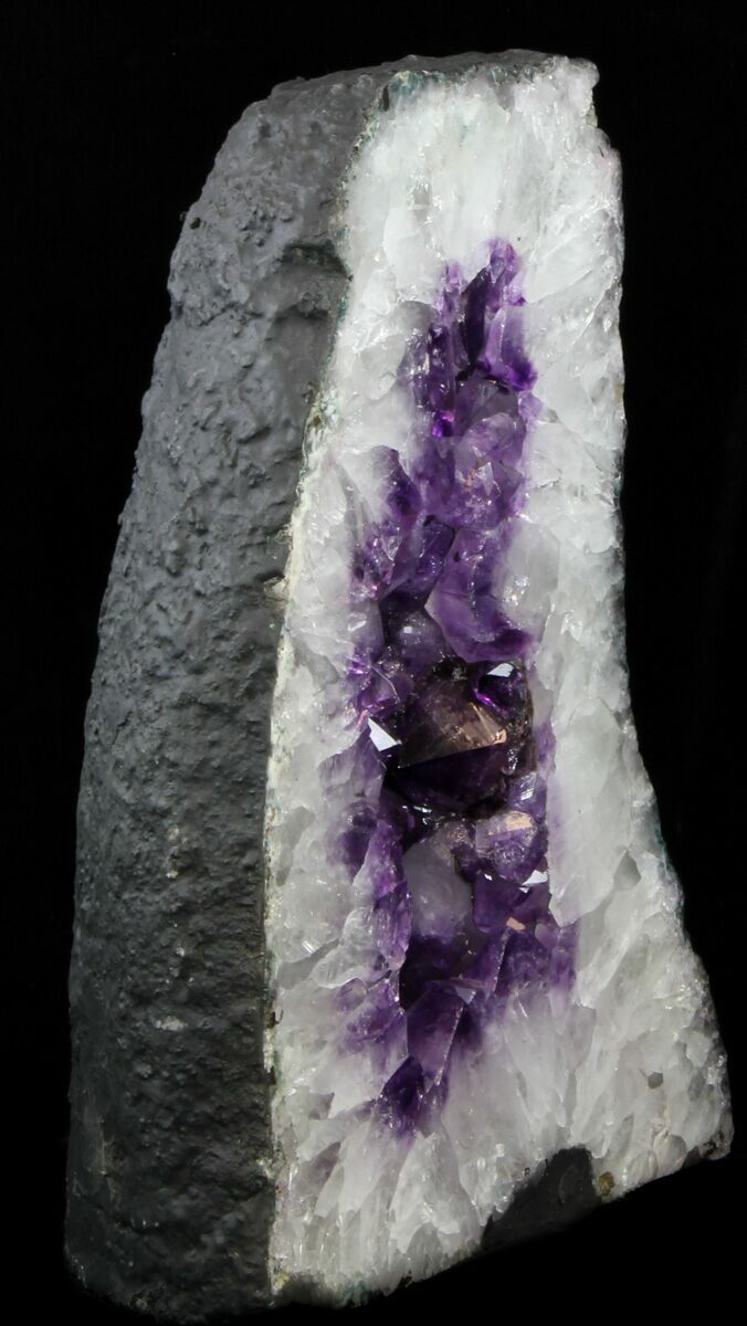 This is a 13.5" tall amethyst geode from Minas Gerais, Brazil. It weighs 30 lbs and is full of large, dark purple amethyst crystals. The amethyst geode has been mounted in an artificial matrix (as is typically done with these geodes) so that it sites nicely on a flat surface. An absolutely beautiful display piece.
