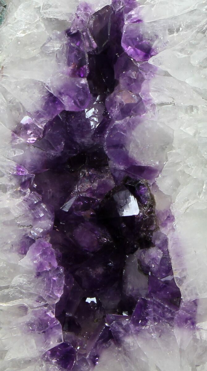Amethyst is a purple variety of quartz (SiO2) and owes its violet color to natural irradiation, iron impurities, and the presence of trace elements, which result in complex crystal lattice substitutions. It is considered a semi-precious gemstone, and just two centuries ago was considered to have a value on par with diamonds, sapphires and rubies.