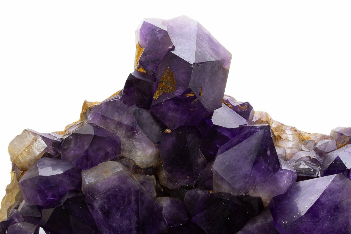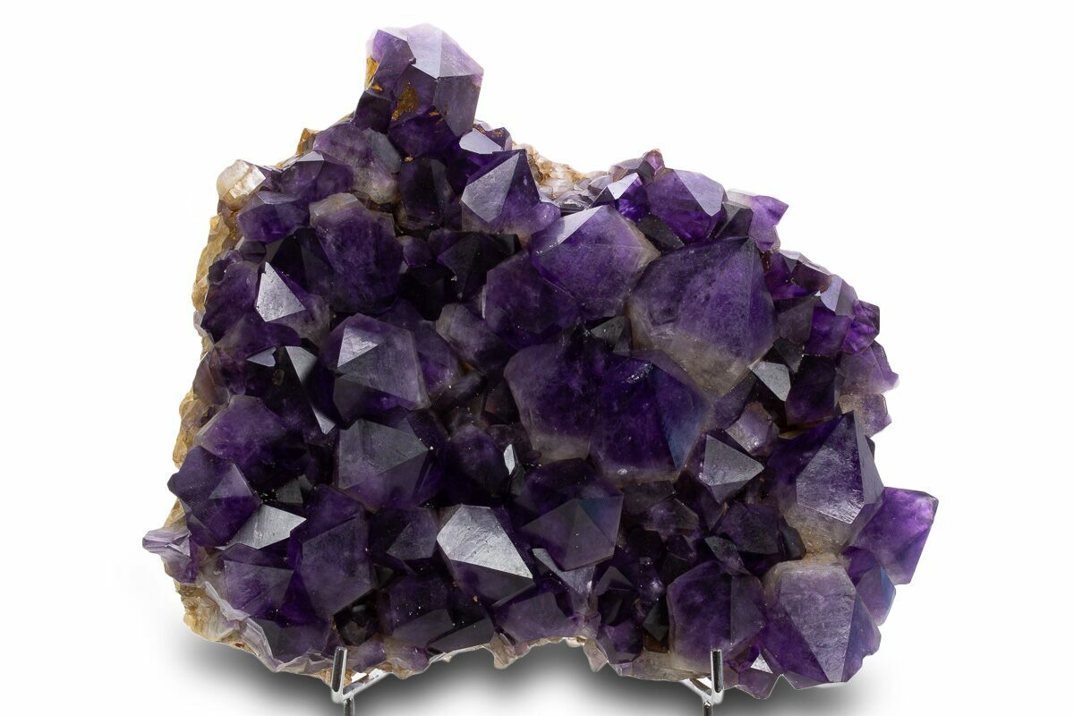 This is a stunning, 13.5" wide amethyst crystal cluster with beautiful purple coloration and exceptional luster, collected from the Democratic Republic of the Congo. These exceptional crystals have undergone no color treatment or polishing. The orange-red color across some of the crystals can be attributed to iron oxidation. There is minor glue stabilization at the base of the crystals.