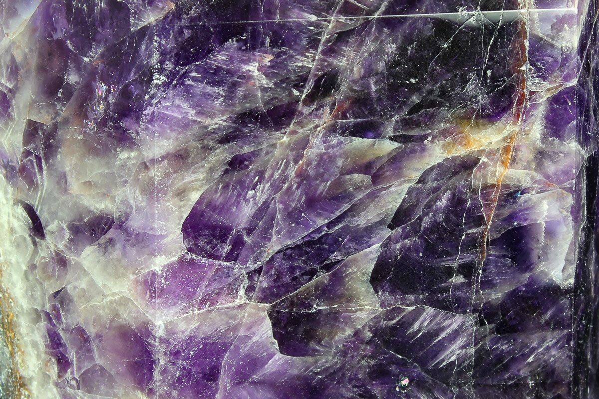 Amethyst is a purple variety of quartz (SiO2) that owes its violet color to natural gamma irradiation, iron impurities, and the presence of trace elements, which result in complex crystal lattice substitutions. It is considered a semi-precious gemstone, and just two centuries ago was considered to have a value on par with diamonds, sapphires, and rubies. The largest and best known amethyst deposits occur in southern Brazil and Uruguay, where they are found in hydrothermally-formed geodes, but many localities around the world produce an amazing variety of amethyst crystals and formations. They are almost always formed in medium- to high-temperature geological settings.