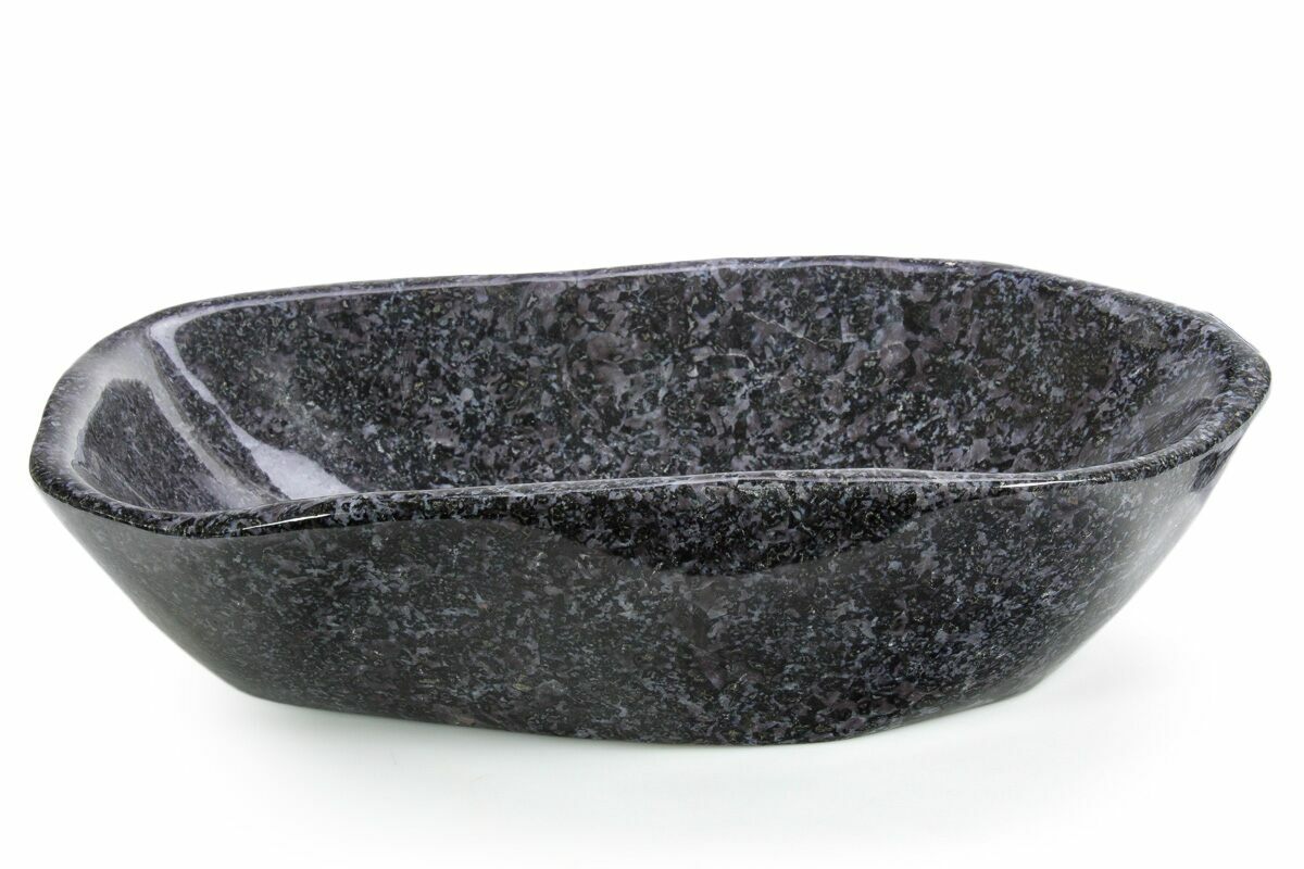 This is a beautifully polished bowl that's formed from a section of indigo gabbro. It's polished to a glossy finish and proves that practicality and style can go hand in hand.