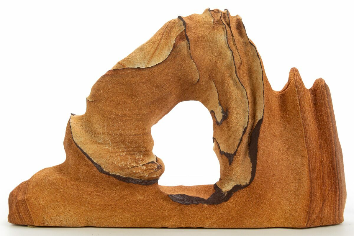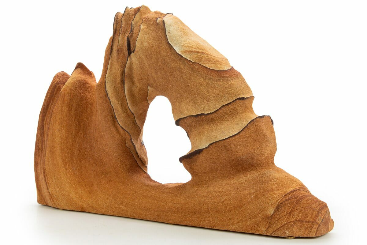 This is a large, 13 wide Toroweap picture sandstone arch. This stunning and distinctive sandstone, mined near Snowflake, Arizona, has been artistically crafted into an arch shape, inspired by natural sandstone formations like Delicate Arch in Arches National Park. The base of this specimen has been cut flat for vertical presentation.