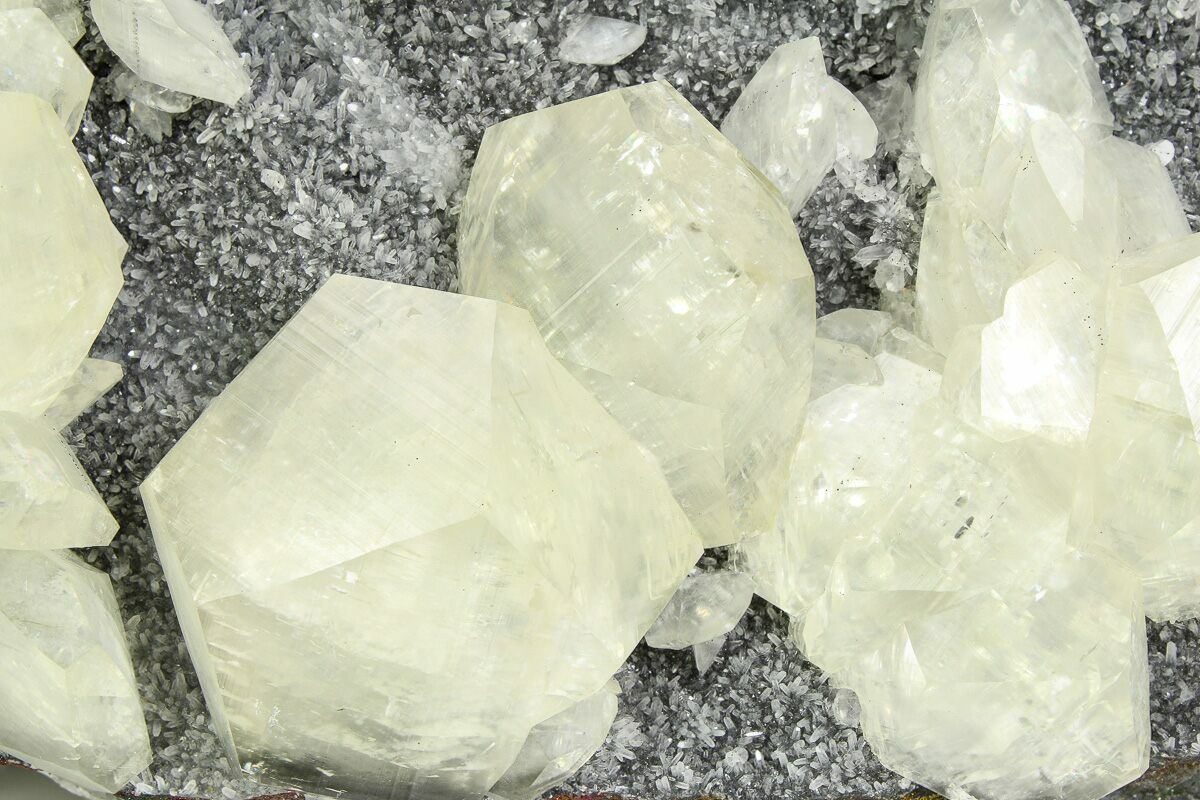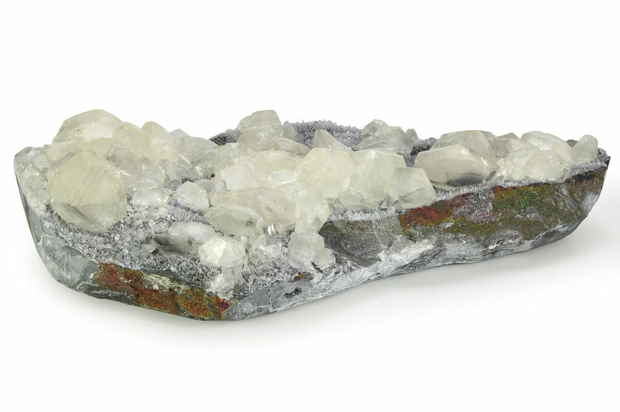 This is an alluring, 14.3" wide mineral specimen comprised of tabular calcite crystals with nailhead spar terminations, scattered across at matrix encrusted in small quartz crystals and iridescent pyrite. Beautiful translucency on these relatively large calcite crystals. This material comes out of the Leiping Mine in Hunan, China.