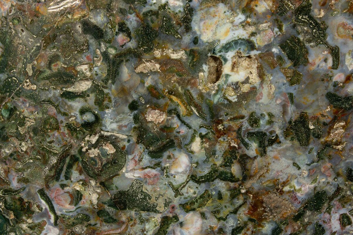 Jasper is a term that can be applied to an opaque variety of chalcedony. The opaqueness is due to a higher concentration of impurities mixed with silica/quartz compared to other varieties of silica, such as quartz or agates. Like agate it may form in a wide variety of colors, and is often multi-colored. In most cases, jasper forms when silica-rich fluids permeate throughout a soft sediment or volcanic debris deposit. The fluids then crystallize around the particles/impurities, resulting in a cementation process. Most often, the impurities present determine the coloration of the deposit following solidification, but other factors can play a role in the color of what is now considered a jasper.
