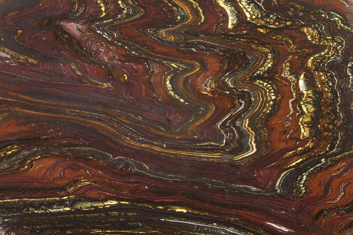 Tiger Iron is composed mainly of tiger's eye, red jasper, and black hematite in an undulating banded pattern. It is mined primarily in two large deposits, one in South Africa and the other in Western Australia. Both deposits are over 2 billion years old!