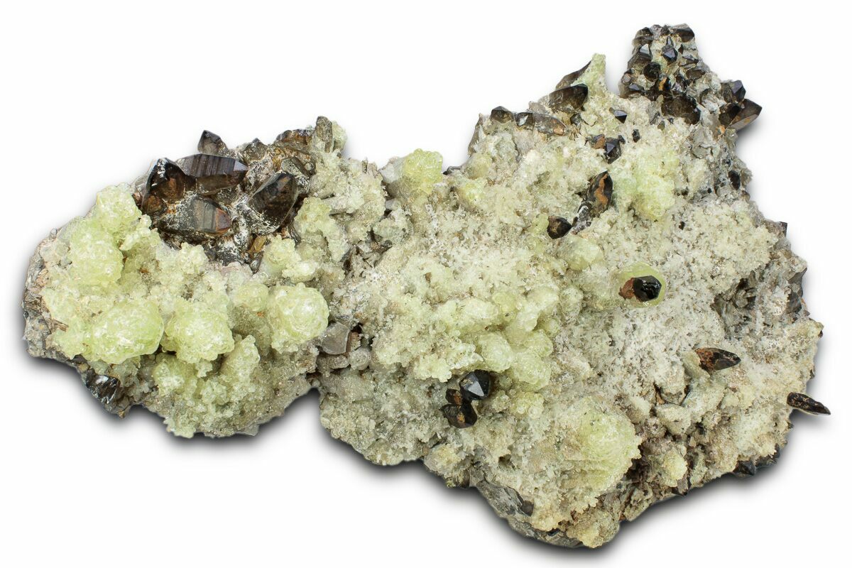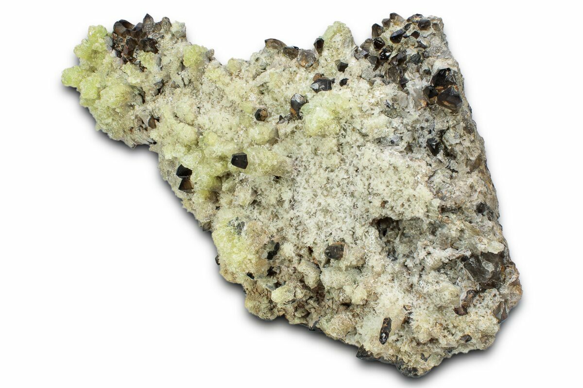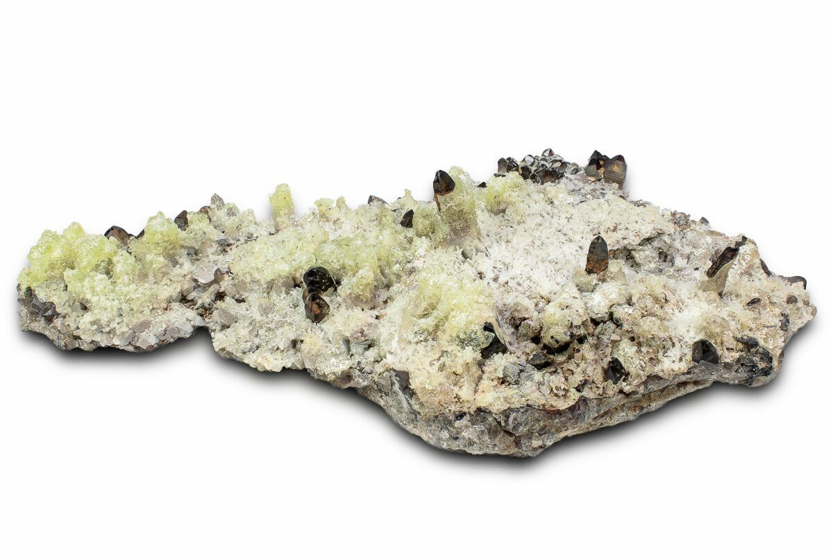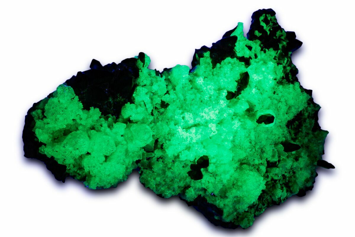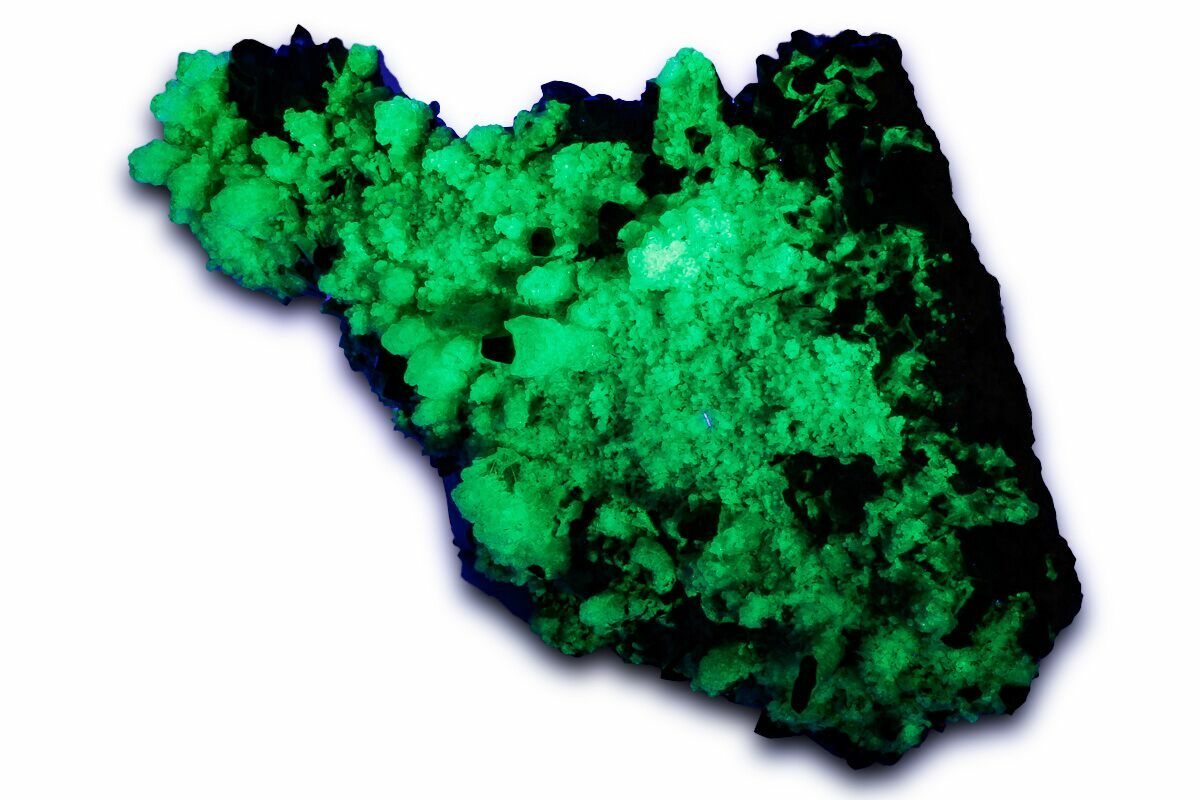 This is by far the most breathtaking and alluring hyalite opal specimen we have ever had available, let alone encountered. The entire specimen measures 17" wide and features colorless to green hyalite opal encrusting a plate of smoky quartz crystals. Many of the smoky quartz crystals can be seen peeking through the hyalite opal and clustered around the periphery. Under both longwave and shortwave UV light, the hyalite opal exhibits a vibrant green fluorescence. A photo of this fluorescence can be seen above. The reaction to shortwave UV is a result of trace uranyl ions.
