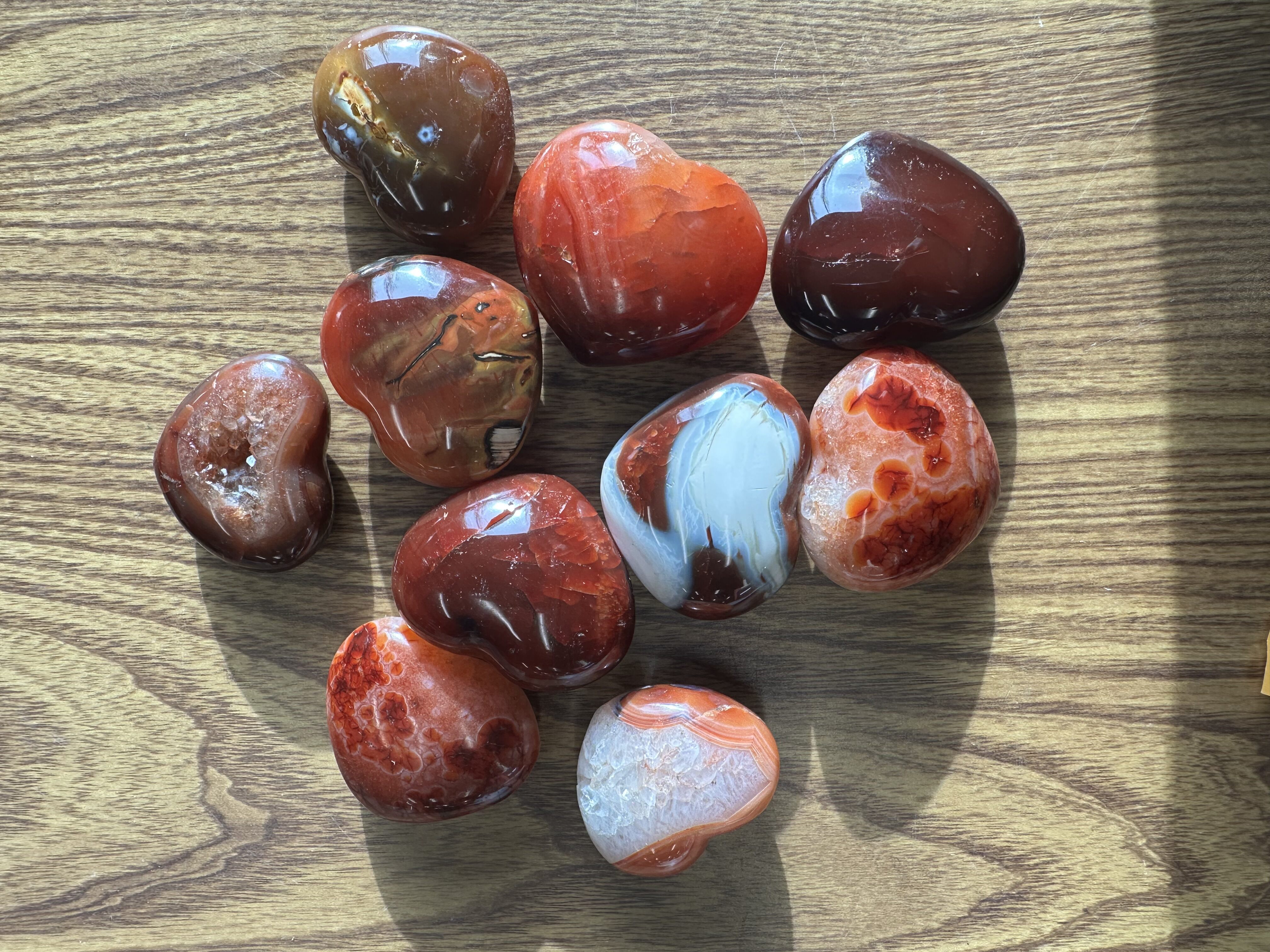 This is a richly colored piece of carnelian agate, carved and polished into the shape of a heart. The carnelian is mined in Madagascar and has wonderful deep red and brown colors.