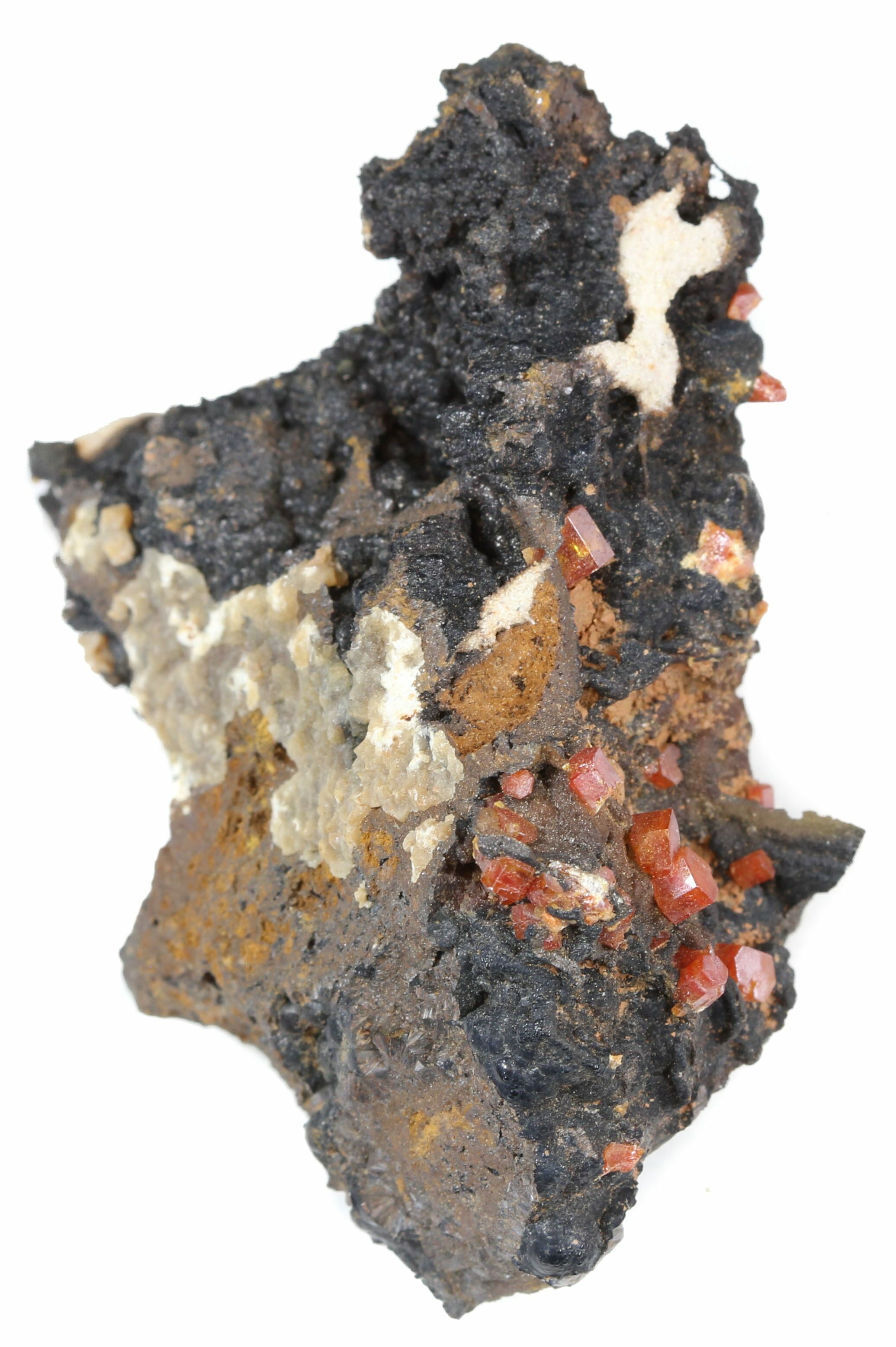 This specimen contains lustrous red Vanadinite crystals, naturally displayed on an iron-manganese oxide matrix.