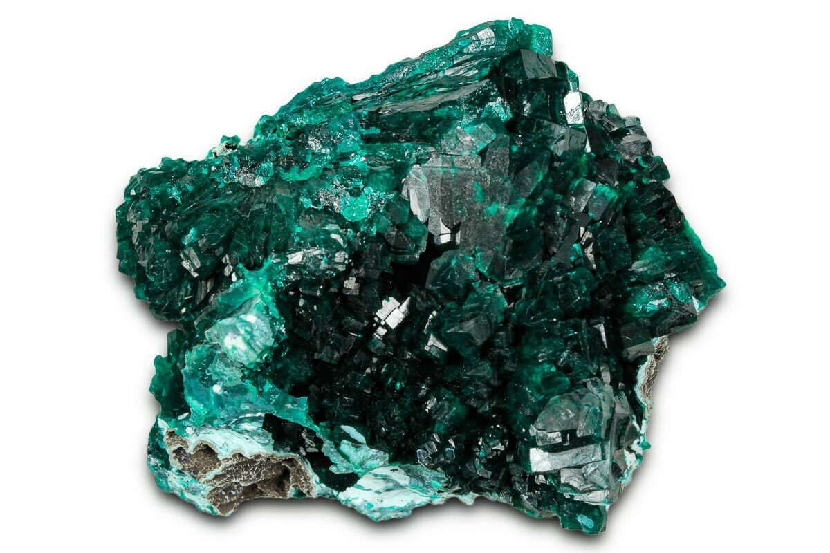 This is a striking 2.05" wide cluster of large, emerald-green dioptase crystals mined in the Congo. The specimen features sharply terminated, glassy crystals with exceptional translucency and the intense, saturated green color that has made Congolese dioptase one of the world’s most coveted copper silicates.