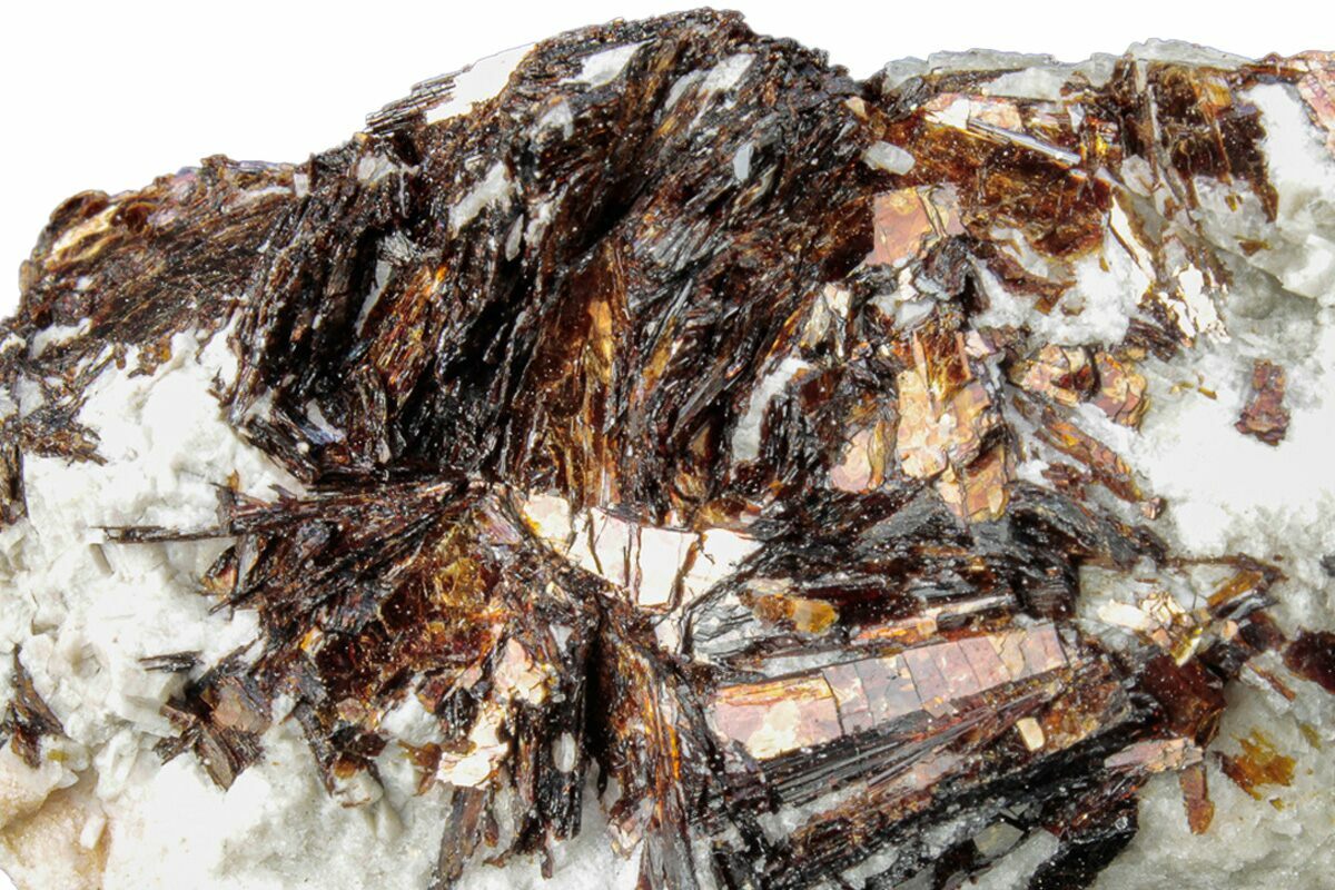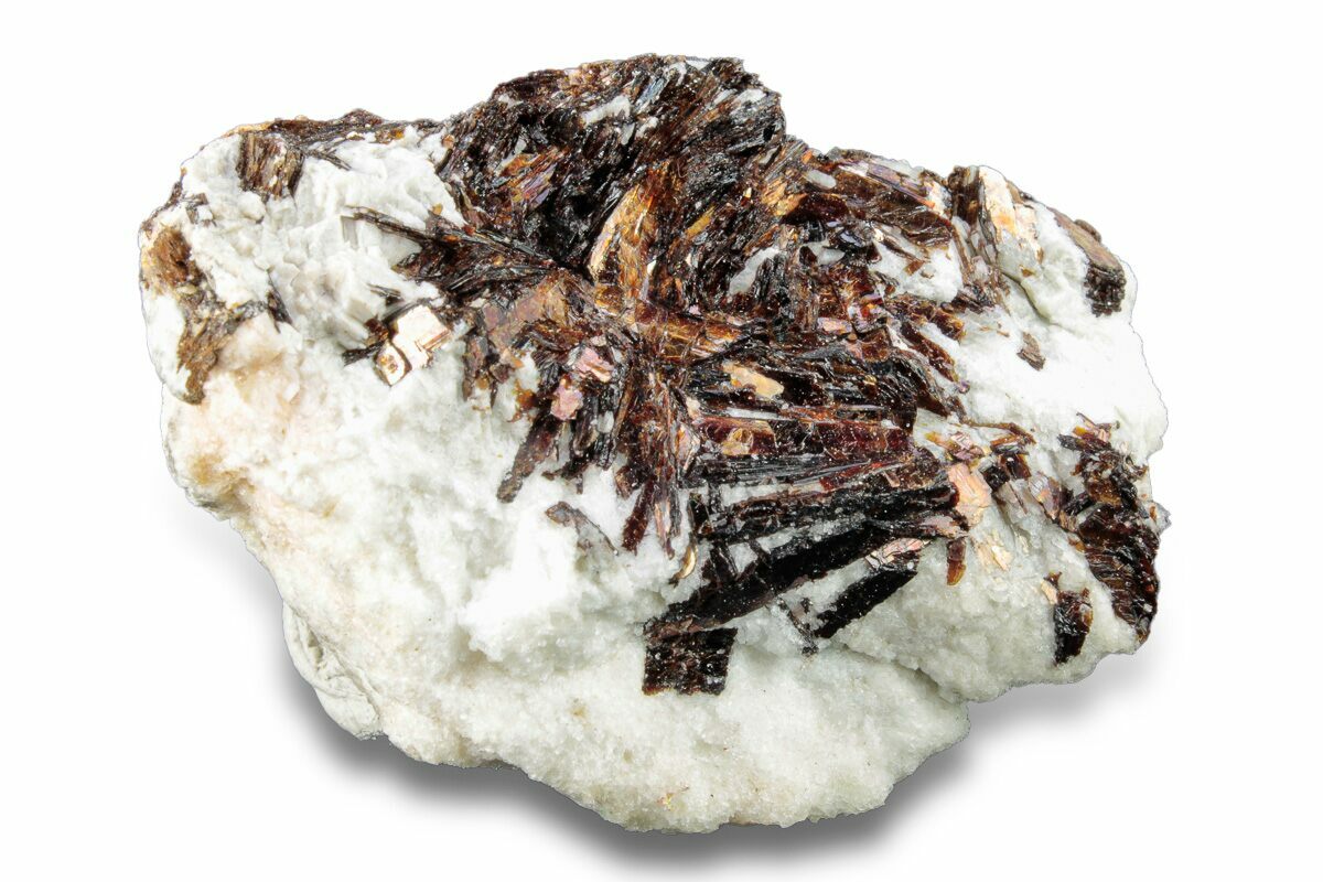 Astrophyllite is a rare hydrous potassium iron titanium silicate mineral with the chemical formula (K,Na)3(Fe++,Mn)7Ti2Si8O24(O,OH)7. It commonly forms as radiating, bladed aggregates of soft and brittle crystals, colored golden-yellow to brown. Due to the fragile nature of astrophyllite crystals, they're usually left in situ (within surrounding matrix) for presentation. However, this hasn't stopped jewelers from incorporating polished astrophyllite specimens into jewelry.