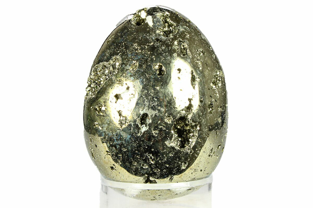 This is a chunk of pyrite (fool's gold) from the mines of Peru which has been cut and polished into an egg. The cavities within the egg are full of small pyrite crystals. An excellent specimen!