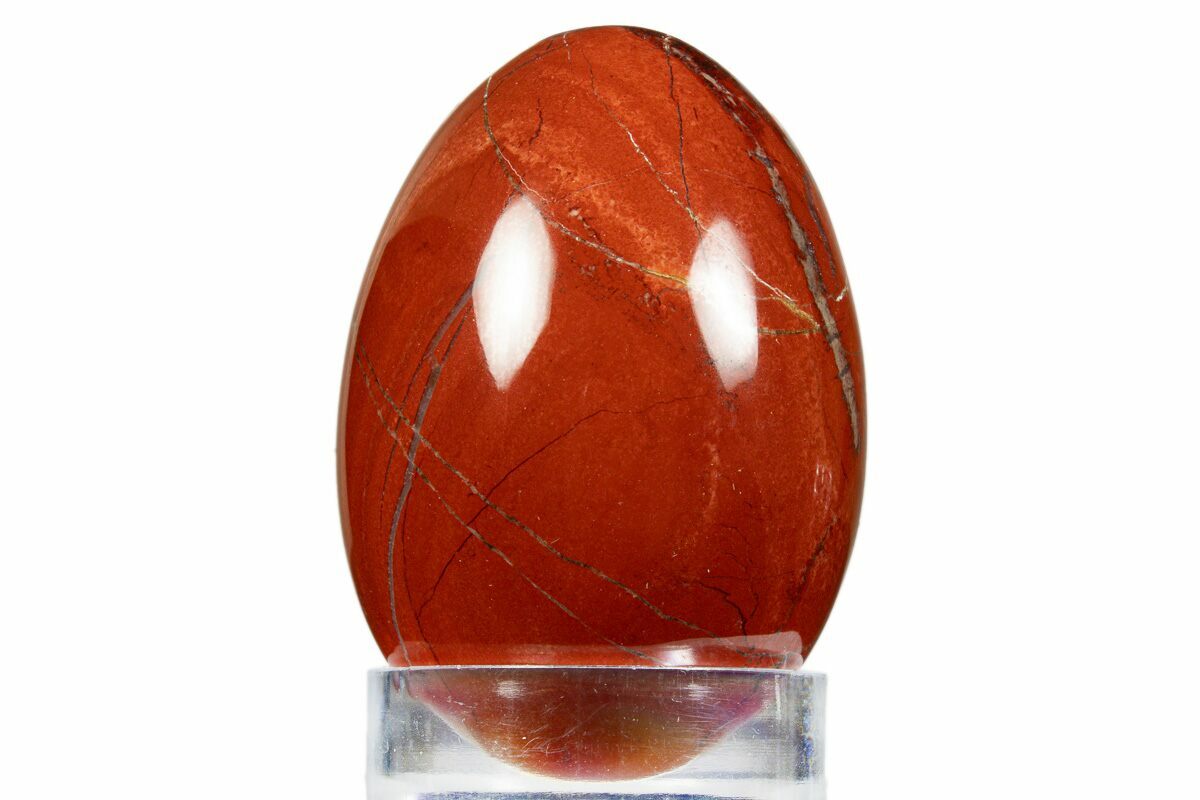 This is a vibrant, 2.05" tall polished egg formed from red jasper with white agate seams, collected in South Africa. The polish work on this egg is second to none with none of the scuff marks or dull areas like those found on lesser quality material.