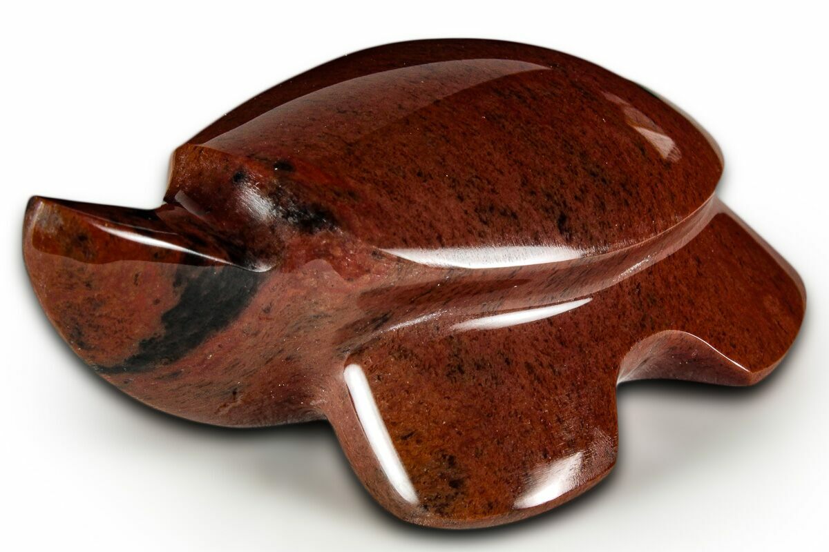 This is a 2.05" long turtle sculpted from mahogany obsidian. This interesting stone is mined near Glass Butte, Oregon. This obsidian specimen has been polished, revealing the swirls and streaks of red/orange color that give this form of obsidian its name.